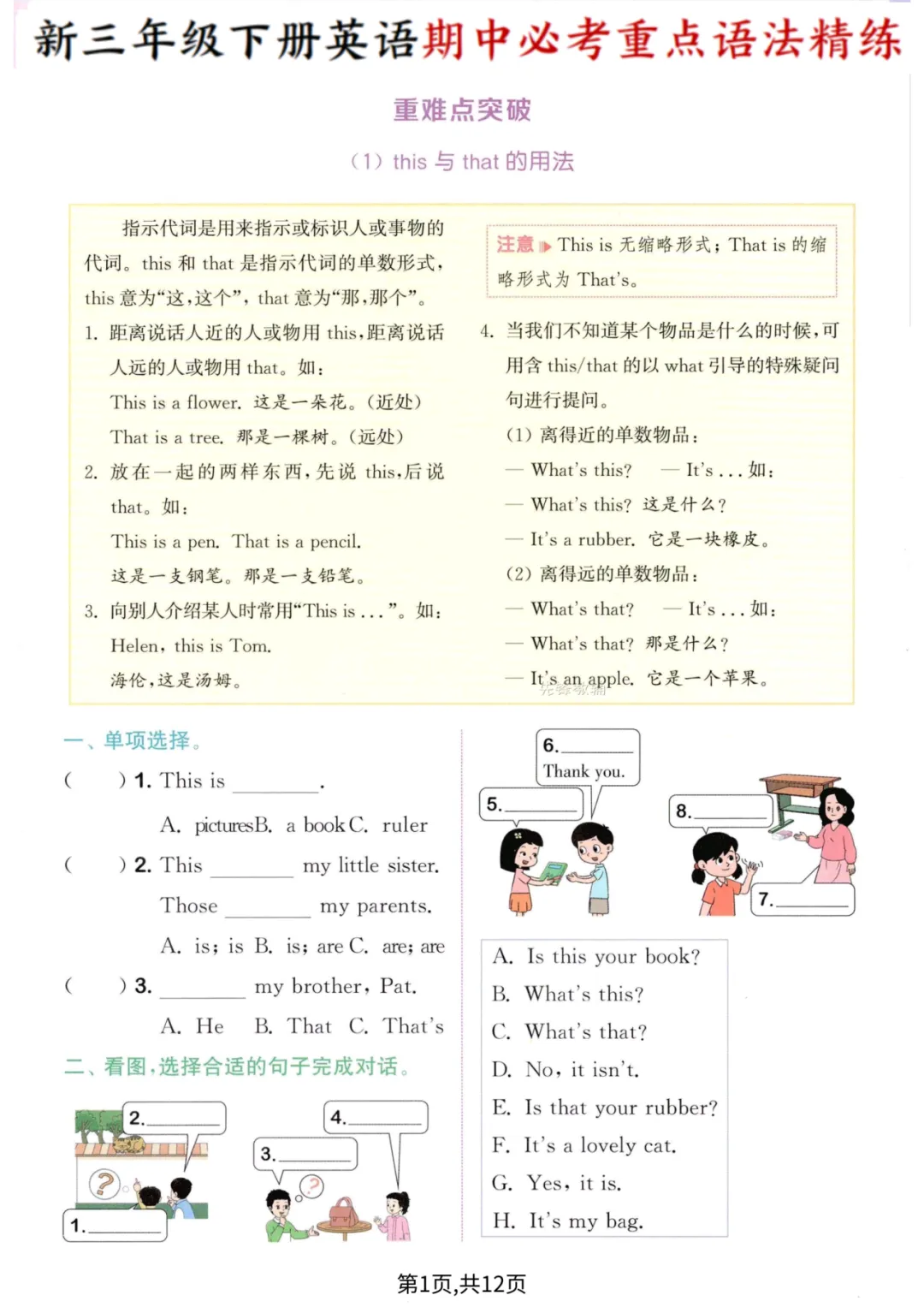 这份资料清晰梳理了近远指代、并列物品、介绍他人、特殊疑问等核心规则,标注易错缩写提醒,搭配针对性练习题,从基础到实战全覆盖。帮孩子彻底吃透指示代词用法,精准掌握期中考点,预习复习都能用,轻松攻克语法难点,考试不丢分!