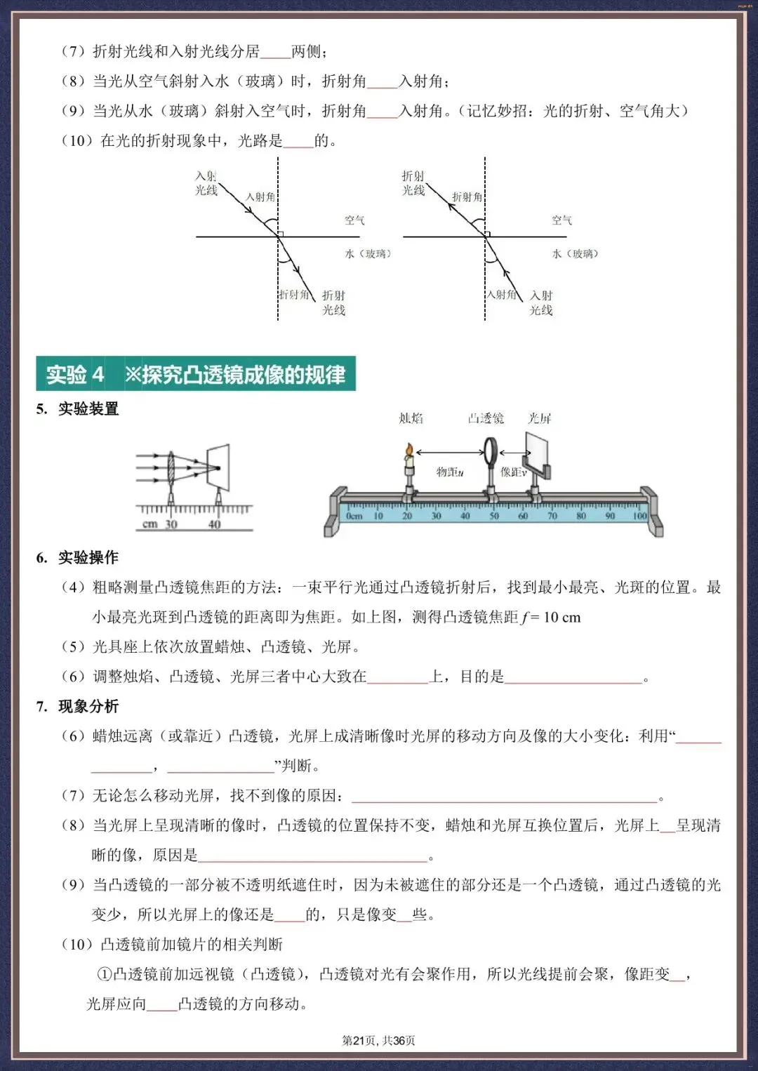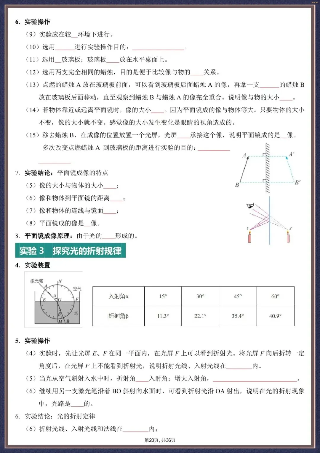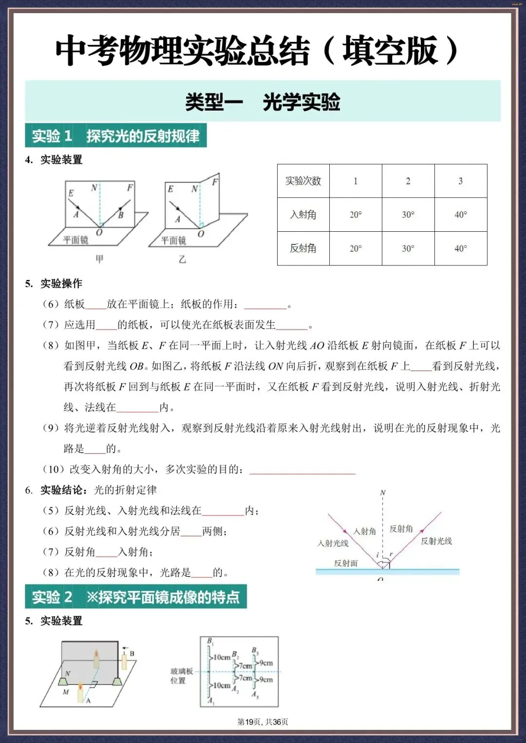 今天为大家整理的是夯实考点・2026 中考物理实验填空版汇总 36 页,以下为部分文字版+图片梳理:实验 1 探究光的反射规律