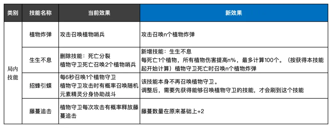 新效果:【植物炸弹】替换原本的【植物哨兵】。【植物炸弹】效果如下:召唤1个自动索敌的植物炸弹(全屏范围索敌),会自动寻找最近的目标,接近目标后自动爆炸,造成植物炸弹攻击力X%的伤害,植物炸弹移动速度快,存在时间短(时间到后原地爆炸)。