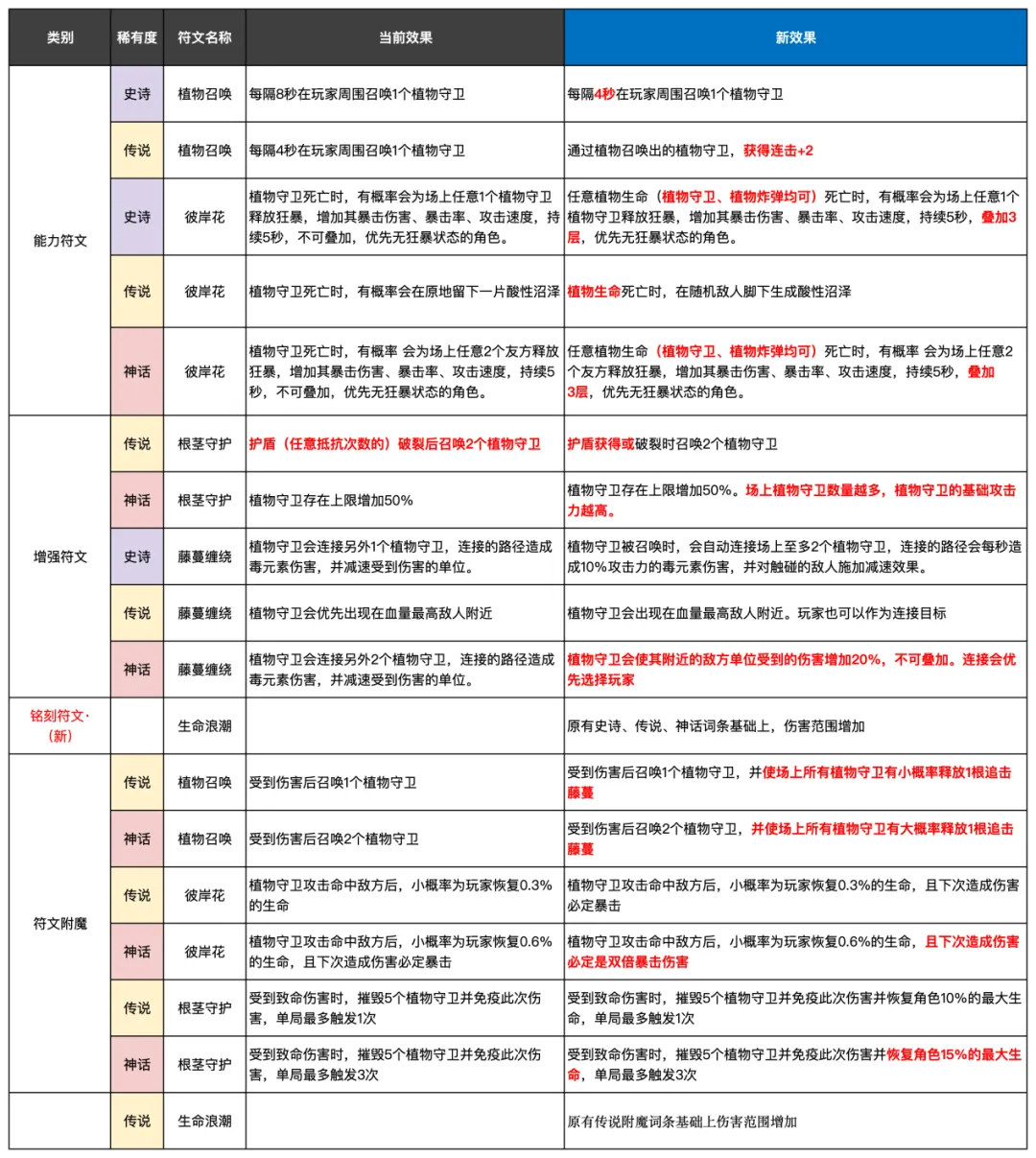 为了给大家带来更好的游戏体验,在充分收集弓箭手们的建议与反馈后,我们对植物流派、精灵流派进行了一次大型调整和增强!调整涉及局内技能、符文词条、符文附魔词条等方向,具体调整情况如下。