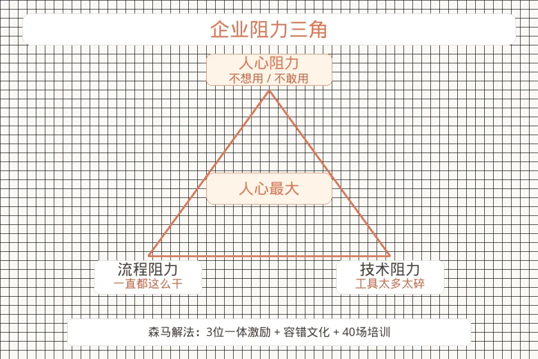 保守心态处处存在。CEO必须是第一个相信者——在关键决策中率先采用新流程、承担失败风险,组织才会跟上。