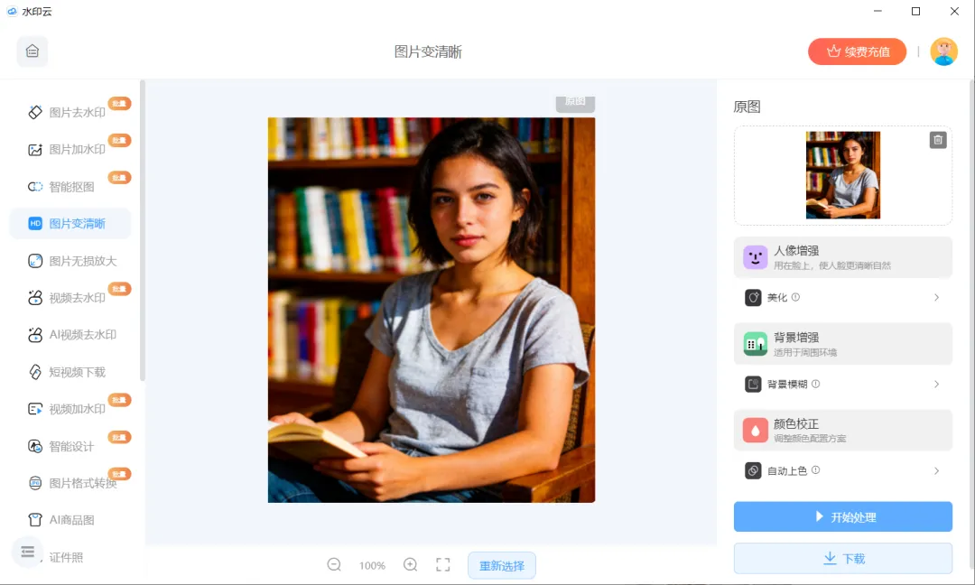 核心亮点:内置多种 AI 模型,覆盖通用、人像、降噪、上色、划痕修复等场景;支持超清放大、运动模糊修复、暗光增强;实时预览效果、批量处理效率高;操作简单,适合电脑端专业修图