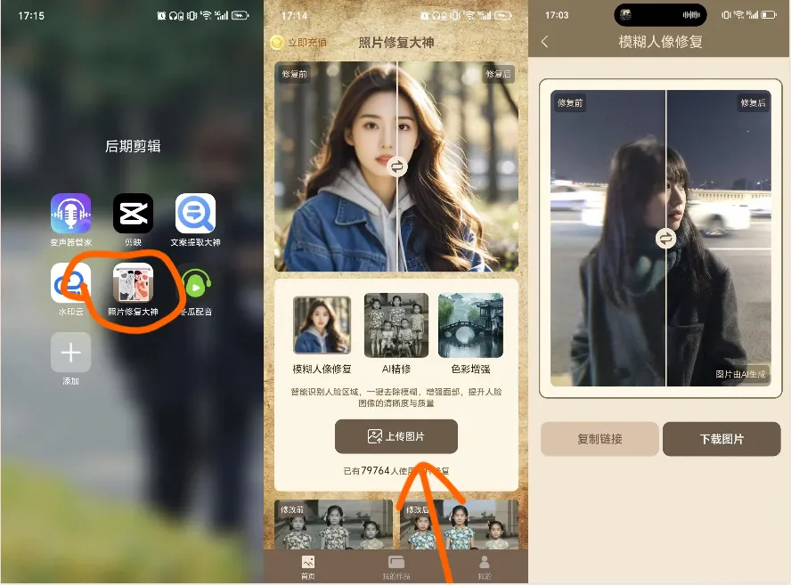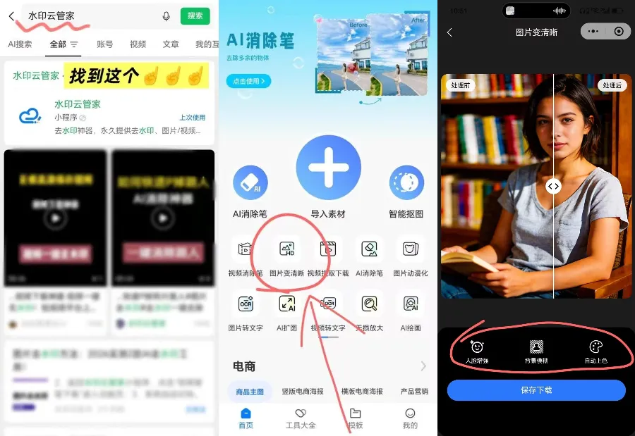 核心亮点:同步水印云核心 AI 算法,专攻图片变清晰 + 老照片修复;支持批量处理、免费版无次数限制;微信内直接导入素材,无需转发,应急修复高效;兼顾瑕疵修复与色彩优化,老照片焕新效果好