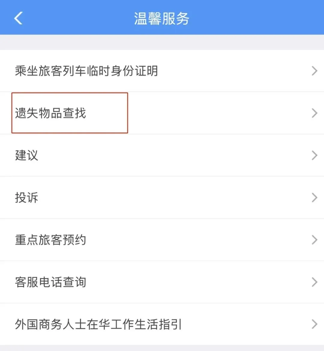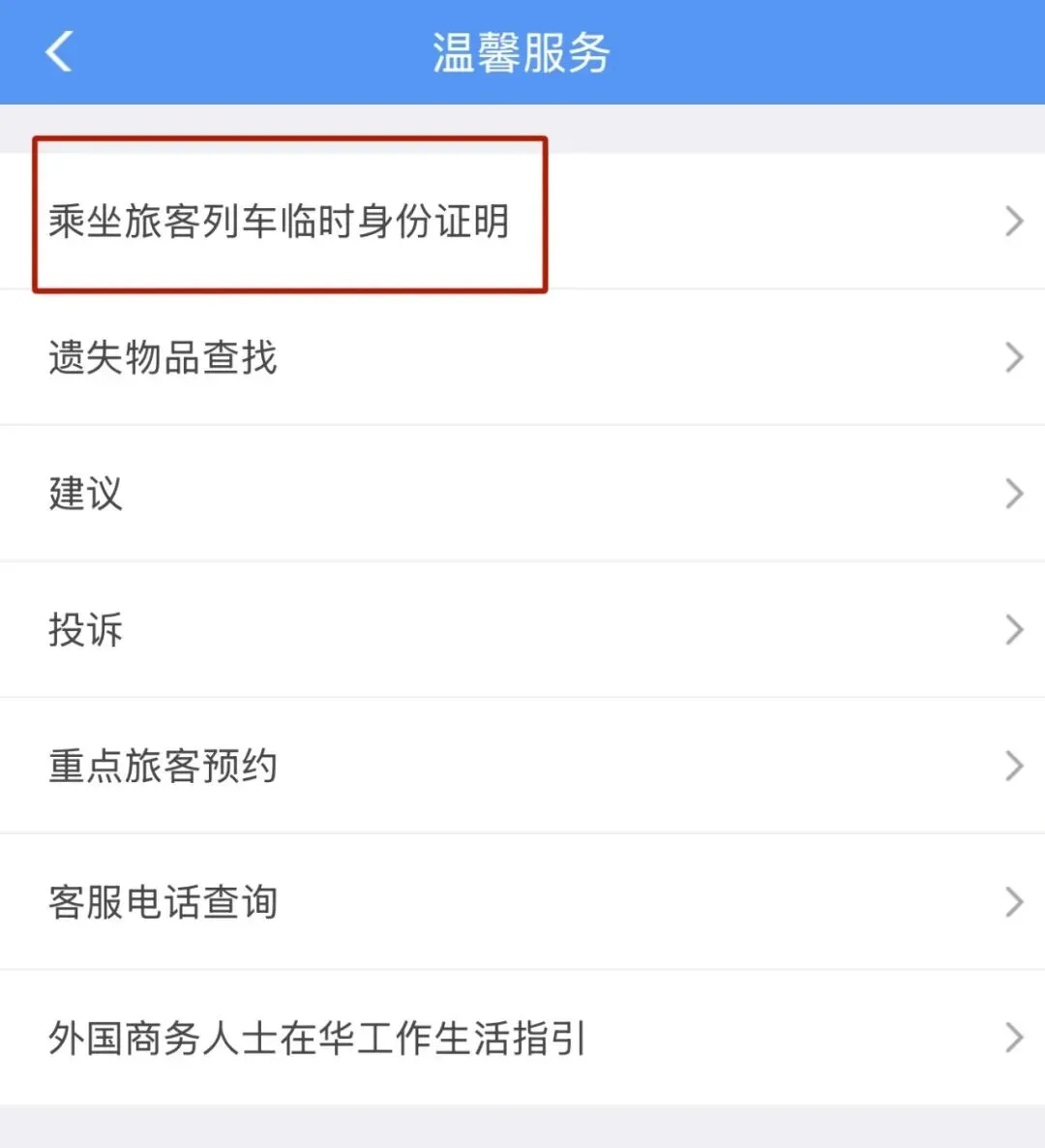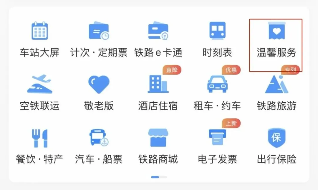 在12306App首页点击“温馨服务”