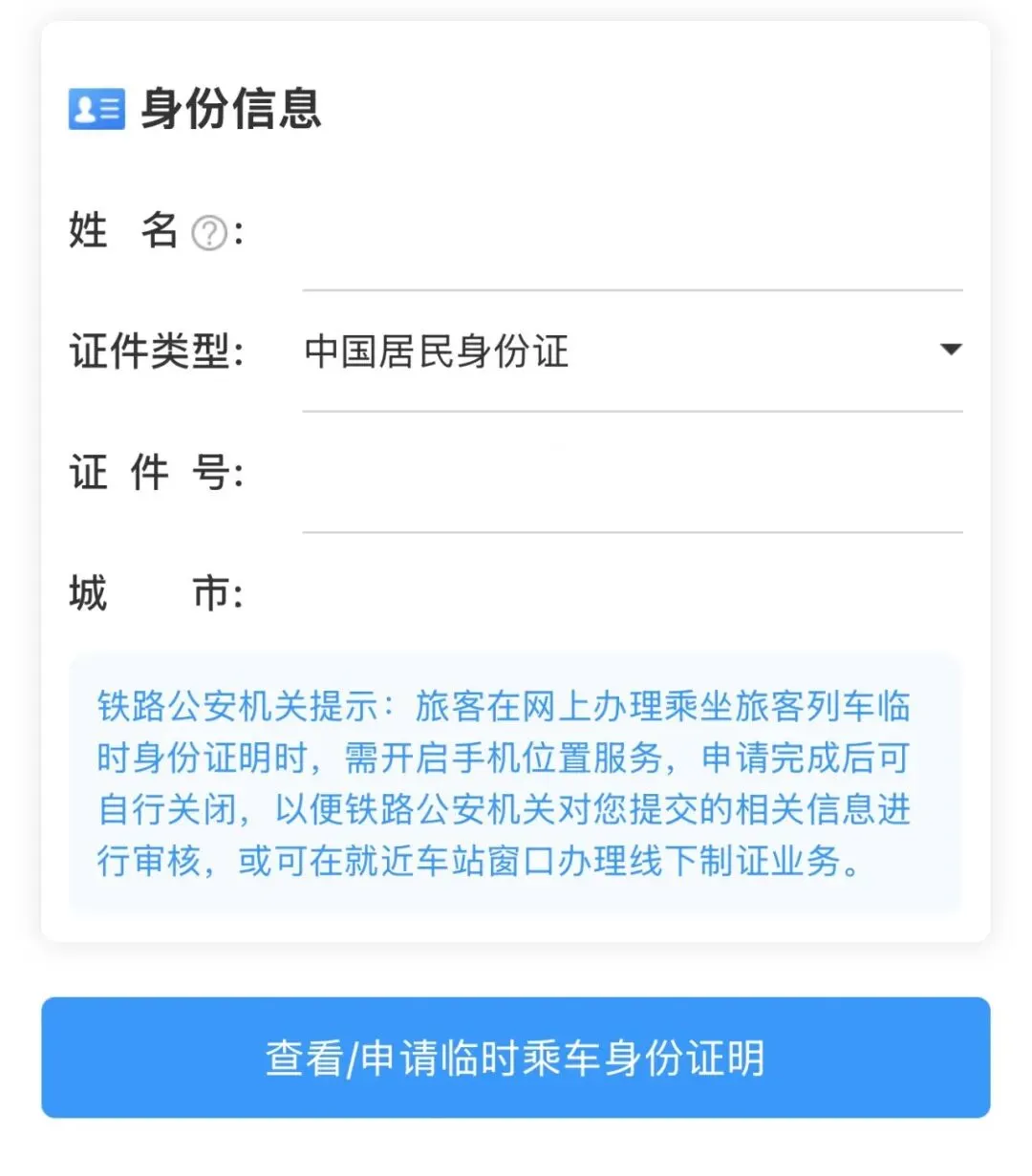 选择“乘坐旅客列车临时身份证明”