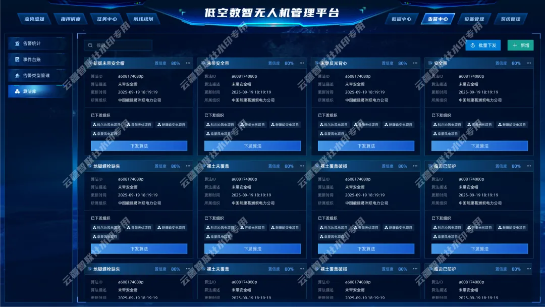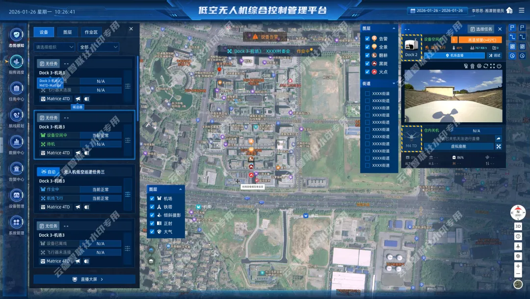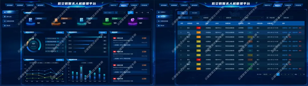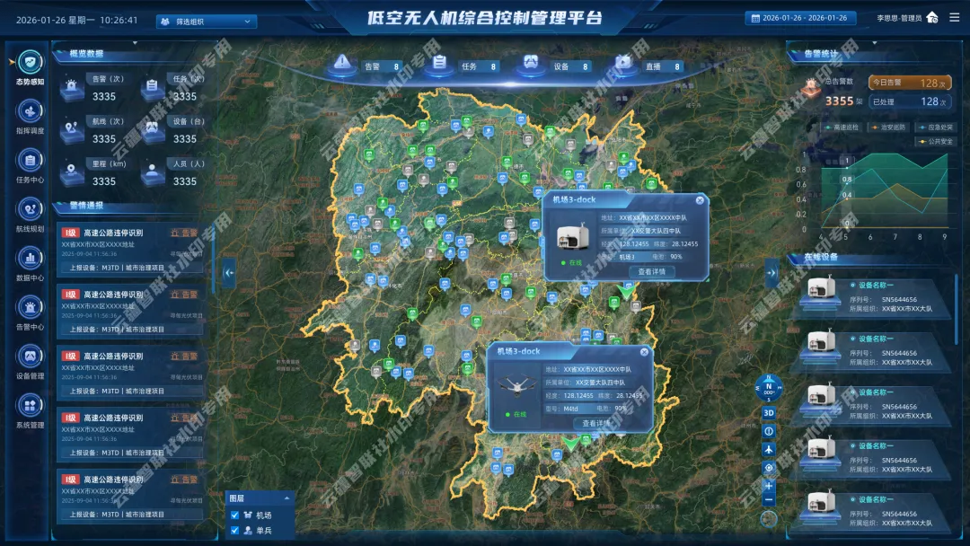 低空无人机综合控制管理平台该平台是一套面向城市治理、公共安全与行业巡检场景的无人机智能管控与数据可视化系统。通过整合设备管理、飞手管理、任务调度、告警监测、算法中心与数据研判等核心模块,实现对无人机集群的一图统览式运营管理。