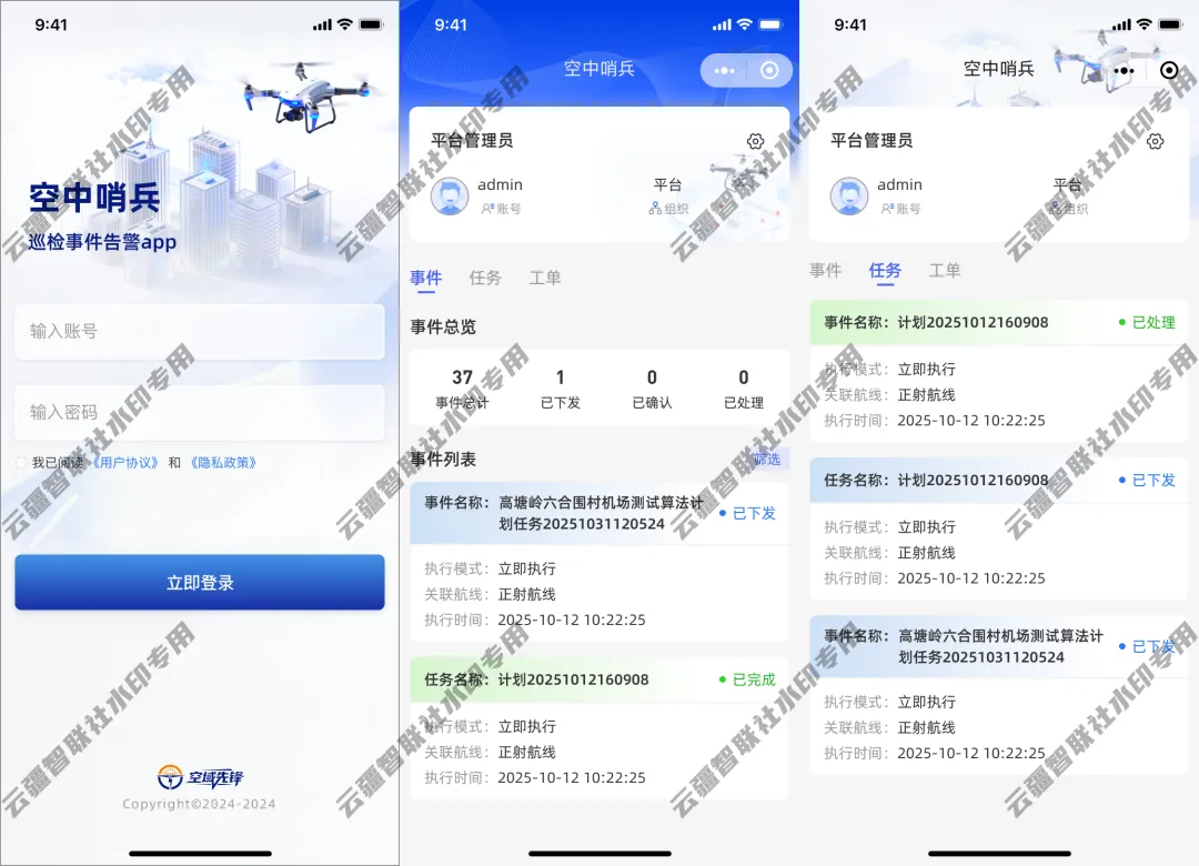 控制模块涵盖航线规划、任务管理、数据回传;AI识别集成人车、烟火等十多种算法,实时捕捉异常;三维建模集成22维震慑与三维模型功能。配套单兵APP(无人机控制)和手机移动端APP(线下工单),提升操作灵活性。