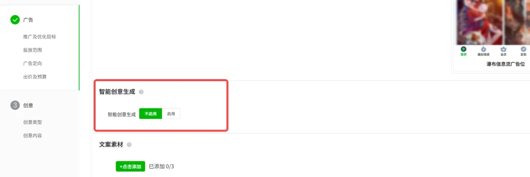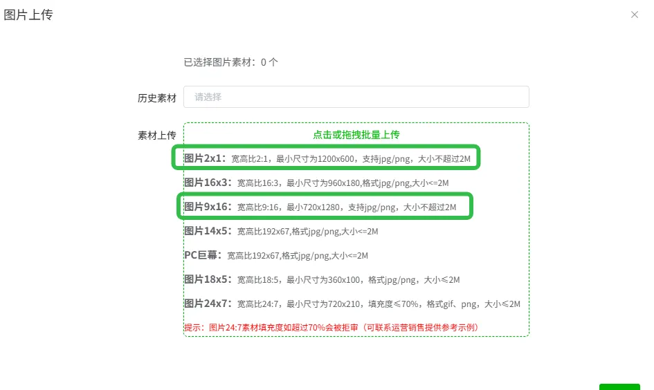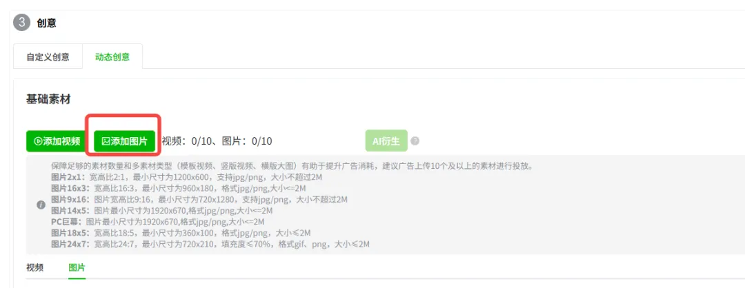 1.Step1:动态创意tab下,进行添加图片 ○ 非衍生的图片9:16/图片2:1素材
