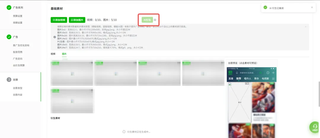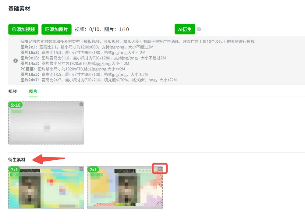 按钮使用条件: 1.上传至少1个图片2:1或图片9:16素材(非本功能产出的衍生素材) 按钮置灰不可使用状态原因: 1.无符合衍生要求的素材 2.已经处在衍生状态中,需等待60s后按钮恢复,可再次触发衍生 功能使用限制: 1.当前页面最大有效请求5次后置灰(仅衍生成功算作一次,衍生失败不算做请求次数) 2.每个原始素材最多衍生2张素材,原始素材>5,最多随机返回10张衍生素材 3.当前广告天维度最大衍生素材不超过50个,当前广告累计衍生最大不超过200个 4.当前创编页如重新加载(如编辑、刷新等)可再次请求 其他说明: 1.衍生成功后,再次点击【AI衍生】,默认放弃上次衍生全部结果,重新触发衍生 2.删除原始素材时,衍生不同步删除,可手动右上角删除 3.衍生素材最多仅10个,即动态创意下最多30个素材(10视频/10图片/10衍生) |