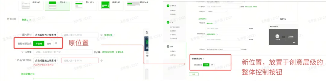 智能创意衍生使用说明:(产线升级) 1.按钮默认为<不启用>,需手动调整为<启用>,按钮开启则适配广告下全部支持衍生的创意类型,进行离线衍生 2.本期离线衍生支持的创意类型范围:图片2:1、图片9:16、视频16:9、视频9:16 3.衍生节点:广告开始投放后 衍生素材的条件: 1.智能创意开关开启&审核通过&主创意有效的有效订单 2.系统将基于创意历史投放情况,针对符合上述过滤条件的创意结合AI能力自动生成创意自动化投放,单创意仅衍生一次 |