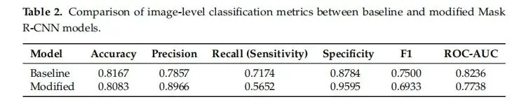 1.图像级分类性能:在测试集上,SE修改后的模型在图像级胆结石检测中表现出更保守的模式。与基线模型相比,其准确率为0.8083,精确度从0.7857提升至0.8966,特异性从0.8784提升至0.9595,但召回率从0.7174下降至0.5652,F1分数从0.7500下降至0.6933。