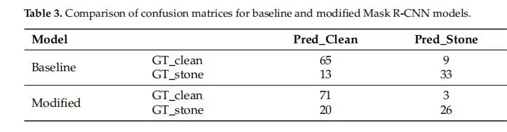 所提出的二分类Mask R-CNN模型的性能在包含结石和干净胆囊图像的独立测试集上进行了评估。对于分割性能,通过将真实二值掩码与模型生成的(最大连通分量)掩码进行比较,计算了Dice相似系数。为了研究SE修改的效果,使用相同的测试方案评估了修改后模型的分割性能。比较显示Dice系数整体略有改善,特别是在异常(胆石症)组中,均值和中间值增加,变异性降低。此外,研究中还实现了一个U-Net模型(以预训练于ImageNet数据集的ResNet-50编码器为骨干)用于分割性能比较。U-Net是最广泛实现的卷积神经网络之一,能够以更少的训练样本实现更精确的分割[24]。该模型使用AdamW优化器(学习率0.0001,权重衰减10^{-8}),批量大小为4,训练了200个epoch。采用OneCycleLR调度器管理训练期间的学习率。为了减少过拟合并提高泛化能力,使用了相同的增强样本数据集,并应用标准ImageNet归一化作为额外的预处理步骤。使用了Focal Loss(alpha=0.8,gamma=2),它非常适合处理前景和背景像素之间可能存在不平衡的分割任务。训练过程在产生最高验证Dice分数的第28个epoch停止,并选择用于评估。模型的性能在相同的独立测试集(训练期间未见)上进行了测试,最终预测掩码使用sigmoid激活阈值0.5生成。所有评估模型整体分割性能的Dice分数指标见表1,分别针对正常样本和结石样本。使用预定义的“黄框”标准评估图像级别的结石检测性能,该标准将图像标记为“结石阳性”,当最大的预测实例属于结石类别且其置信度超过概率阈值时。基于此决策规则,计算了所有测试样本的准确率、精确率、召回率、特异度、F1分数和ROC-AUC。为了评估SE加入的影响,对更新后的模型应用了相同的评估策略。结果显示出现了向保守分类的转变。虽然该模型实现了更高的精确率和特异度,但较低的召回率导致F1分数和ROC-AUC值下降。因此,尽管假阳性和假阴性之间的平衡不同,但无法断定存在总体分类优势。数值结果见表2。还生成了混淆矩阵(表3)以总结真阳性、假阳性、真阴性和假阴性的分布。进行了自助法(有放回重抽样1000次)以估计所呈现的修改后模型和基线模型结果的稳定性。对于每个指标,在保留的测试集上计算了95%置信区间。基线模型获得:准确率=0.818(CI:0.750-0.883),F1分数=0.750(CI:0.643-0.844),ROC-AUC=0.825(CI:0.750-0.897),Dice=0.869(CI:0.835-0.897)。对于修改后模型,结果为:准确率=0.808(CI:0.733-0.875),F1分数=0.691(CI:0.568-0.800),ROC-AUC=0.774(CI:0.701-0.848),Dice=0.895(CI:0.870-0.914)。这些发现表明两个模型均实现了稳定的性能,且由SE修改引入的精确率-召回率权衡也反映在置信区间范围中。除了数值评估外,还生成了视觉叠加图用于定性评估。对于每个测试图像,在输出可视化中显示了预测掩码、真实轮廓和Dice分数。当满足黄框标准时,在预测区域周围显示一个黄色边界框以指示阳性结石检测。示例视觉输出如图3所示。