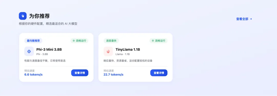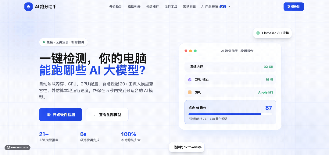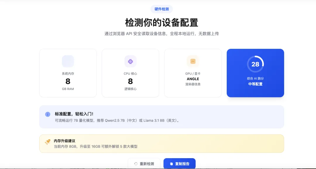 它是一款完全运行在浏览器端的免费硬件检测工具。能自动读取你电脑的内存、CPU、GPU 信息,智能匹配 21+ 主流开源 AI 大模型的兼容性,并给出本地运行速度预估,帮你在 5 秒内找到最适合自己电脑的 AI 模型。