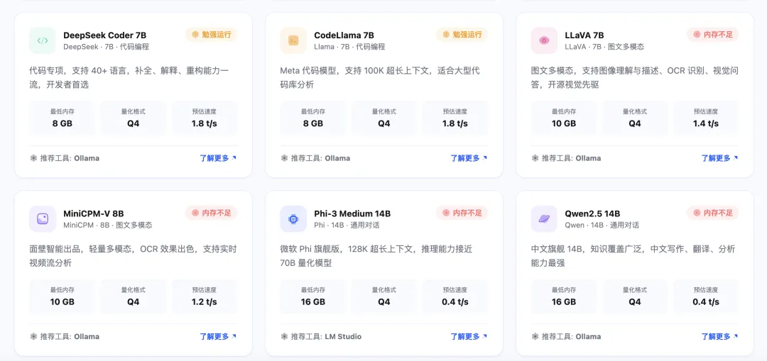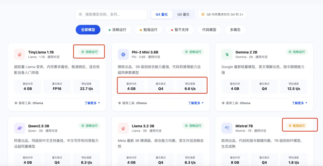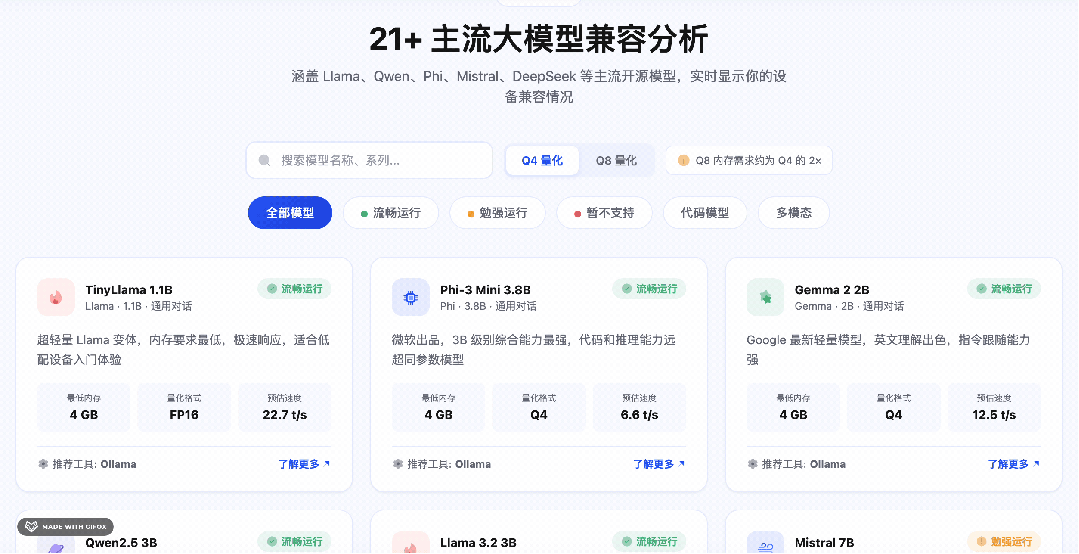 覆盖当前最主流的开源大模型系列,一键发现哪些能跑、哪些跑不动: