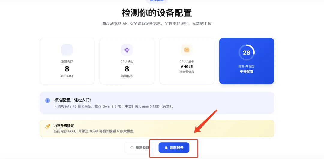 基于内存与 CPU 计算 0-100 综合评分,直观了解你的 AI 能力等级