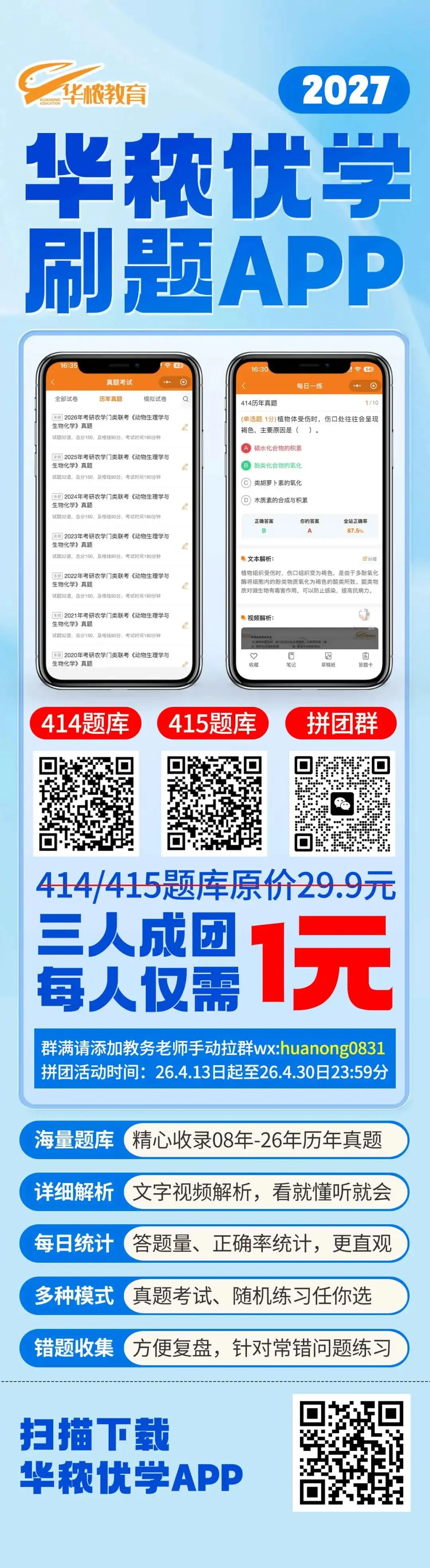 限量赠送100份414/415刷题APP一年使用权限,转发文中【华秾优学APP】海报至朋友圈并配文:农学考研刷题APP,截图发送至教务老师处即可获得!数量有限,送完即止!