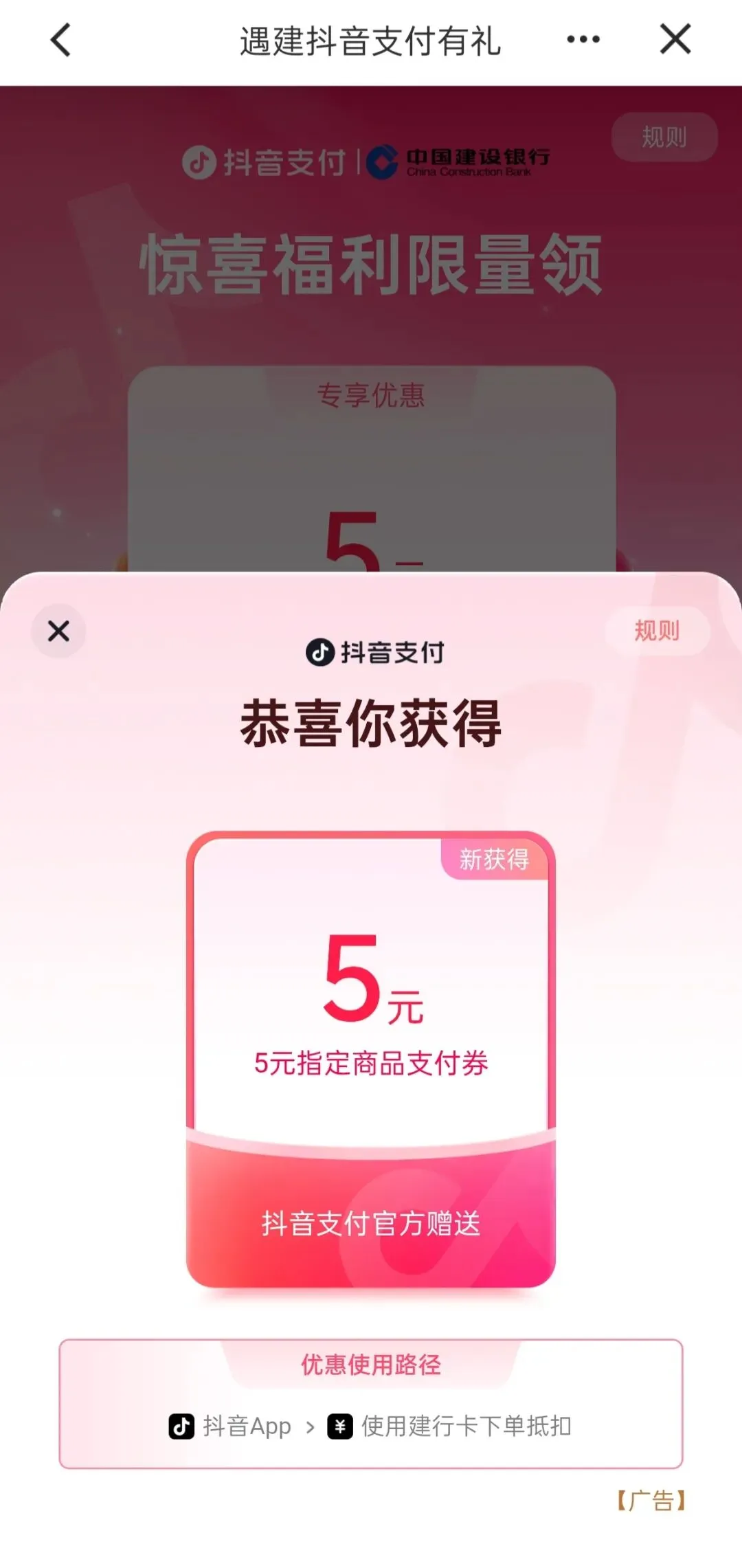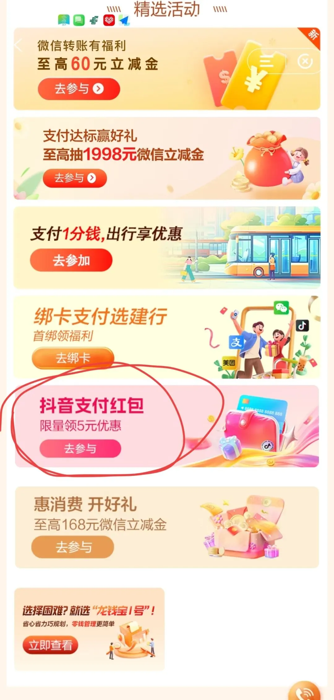 直接上步骤:登录建行APP-搜索“惠省钱”-找到“抖音支付红包”,点“去参与”,就可以了。
