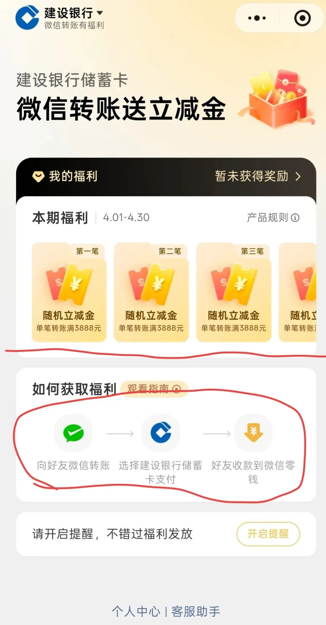 如何获取福利,到截图界面可以看到:向好友微信转账-选择建行储蓄卡支付-好友收到微信零钱