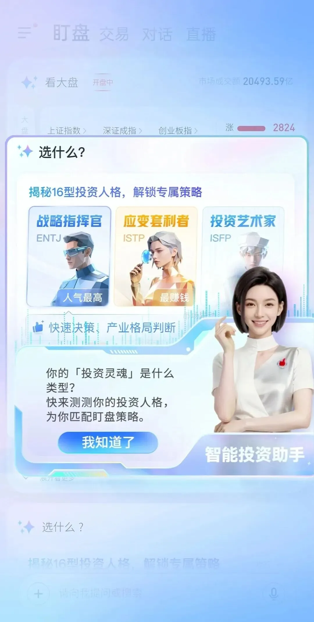 更贴心的是,APP全新上线了6款不同人设的智能投资助手,支持真人、3D科技、二次元多种风格,7×24小时在线提供陪伴式服务。对话界面还集成了智能选股、盯盘提醒、智能诊断等场景化服务,深度融合海量金融数据库和实时行情,哪怕是新手,也能通过对话轻松搞定专业投资操作,真正实现“言出即达”。
