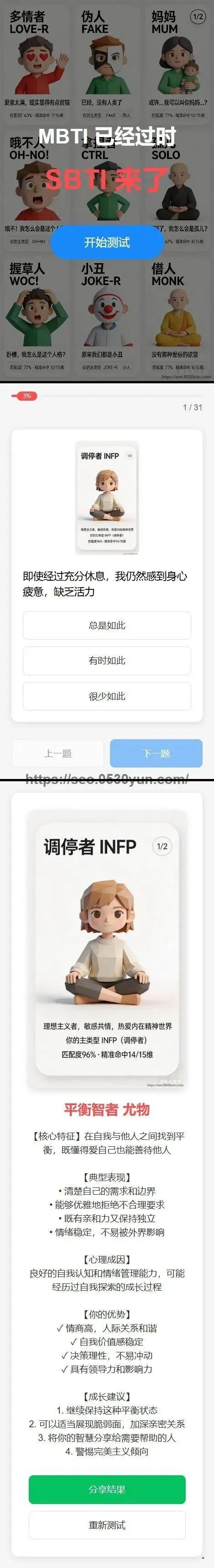 1. **幽默化人格测试** – 将传统MBTI转化为更接地气的搞笑人格类型