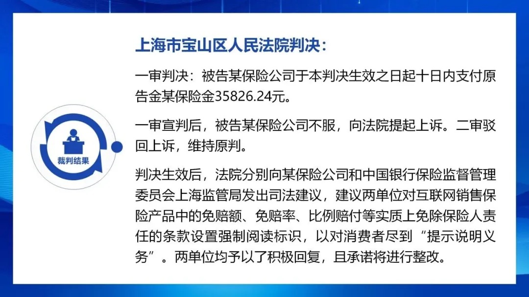 司法建议:法院向保险公司及监管部门发出建议,要求对互联网保险中的免赔额、免赔率、比例赔付等免责条款设置强制阅读与确认环节,相关单位已回复并落实整改。