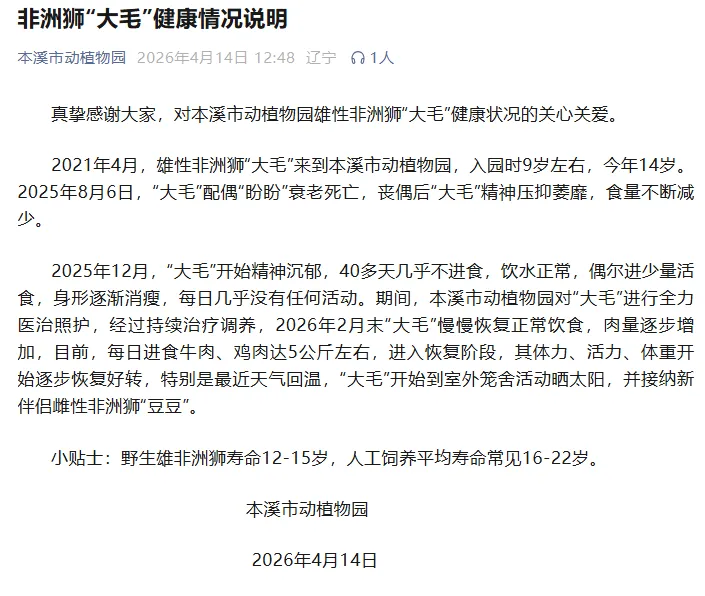 其间,本溪市动植物园对“大毛”进行全力医治照护,经过持续治疗调养,2026年2月末“大毛”慢慢恢复正常饮食,肉量逐步增加,目前,每日进食牛肉、鸡肉达5公斤左右,进入恢复阶段,其体力、活力、体重开始逐步恢复好转,特别是最近天气回温,“大毛”开始到室外笼舍活动晒太阳,并接纳新伴侣雌性非洲狮“豆豆”。