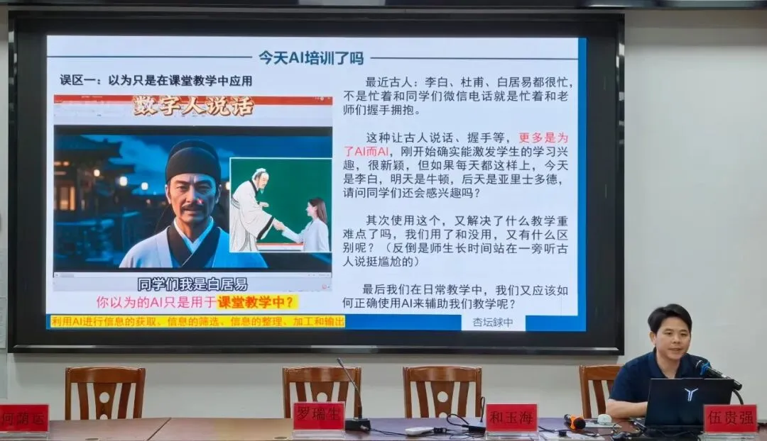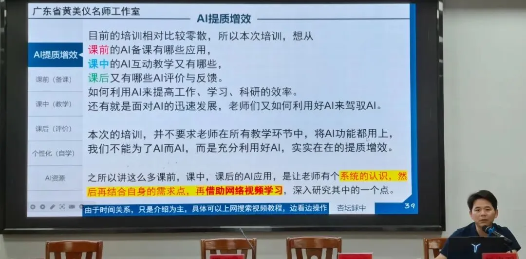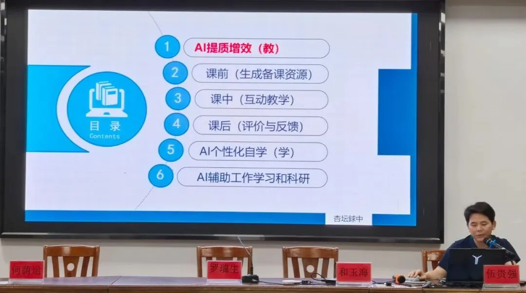 培训中,伍贵强专家聚焦教学实际,精准剖析当前AI教学应用中的形式化、表面化误区,明确指出AI辅助教学应贯穿“备、教、评、学、研”全流程,坚守教育本质、聚焦教学实效,真正实现减负增效、因材施教。