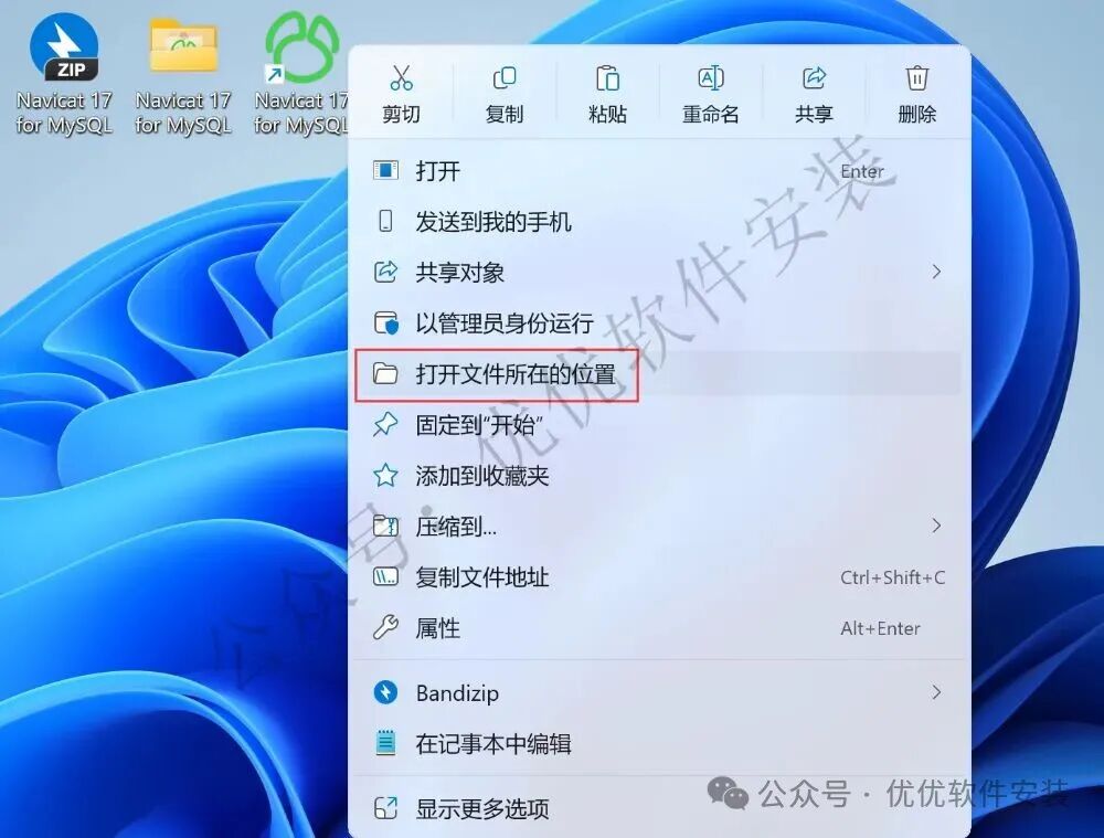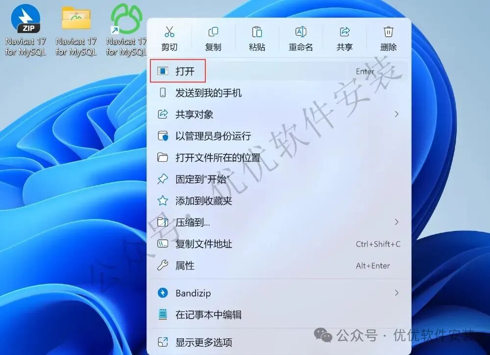 16、回到桌面,右键桌面上的【Navicat 17 for MySQL软件图标】,点击【打开】