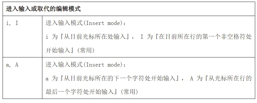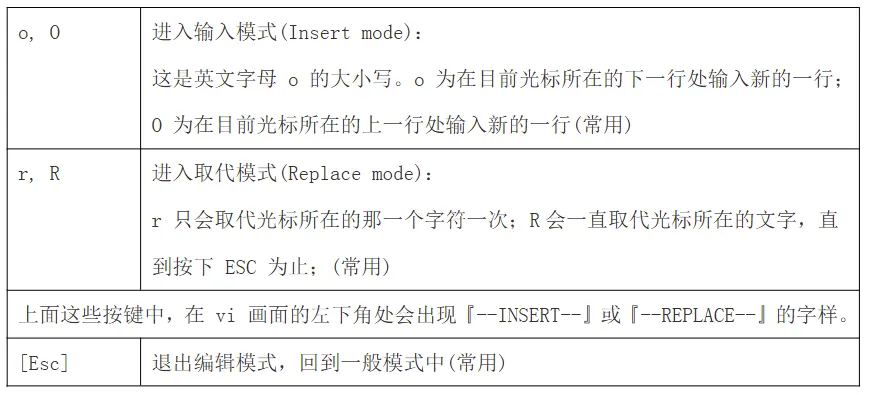 在命令模式下按下 a,i,o 就进入了输入模式。在输入模式中,可以使用以下按键: