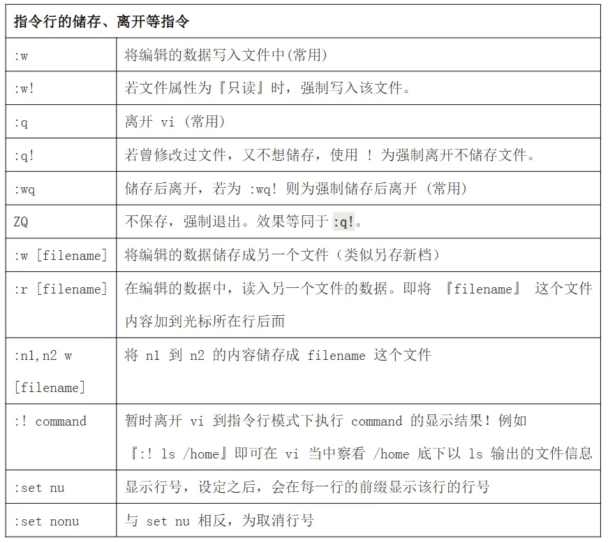 在末行模式中,基本的命令有(已经省略了冒号):