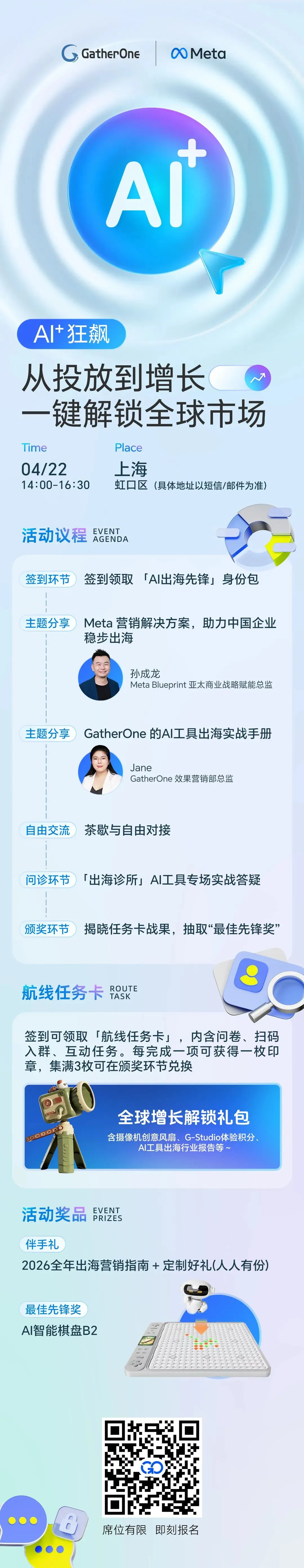 4 月 22 日,GatherOne 联合 Meta 在上海举办“AI+狂飙——从投放到增长,一键解锁全球市场”分享会。聚焦 AI 工具出海实战,把官方洞察、增长打法、专家诊断一次讲透。