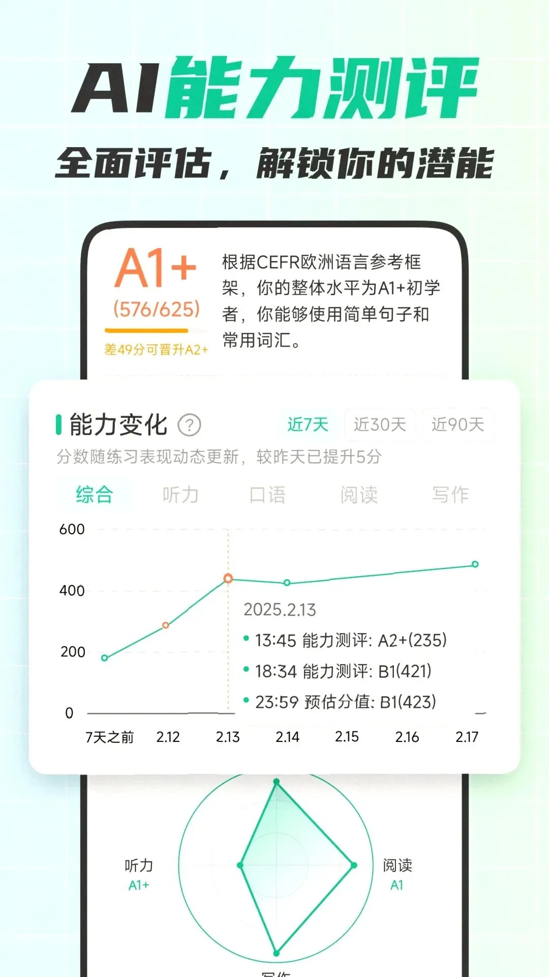 主打场景化对话的口语APP,支持多种语言,基础商务场景课程丰富,AI发音测评功能实用,适合有一定基础的用户拓展表达。