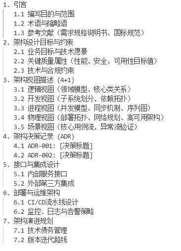 | 4. 架构决策 | ADR记录表、关键权衡分析 | 必须体现“决策-后果”的闭环;避免只有结论没有理由 |