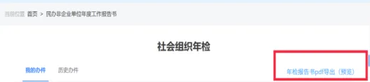 登录“浙里社会组织”,依次点击“年度检查”—“我的办件”—“年检报告书pdf导出(预览)”—下载“年检报告书”。