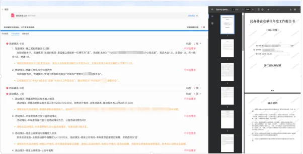 “年检AI助手”是社会组织年度工作报告的智能自检平台,该平台覆盖社会组织党建情况、内部建设、活动情况、财务情况等多维度信息,支持PDF文件上传,可通过线上智能化工具对年检填报情况进行自动检测,检查年检填报数据的正确性、合规性等,并出具检测报告和修改建议,能有效提高社会组织年检申报效率,降低退回率,助力社会组织高效完成年检工作。