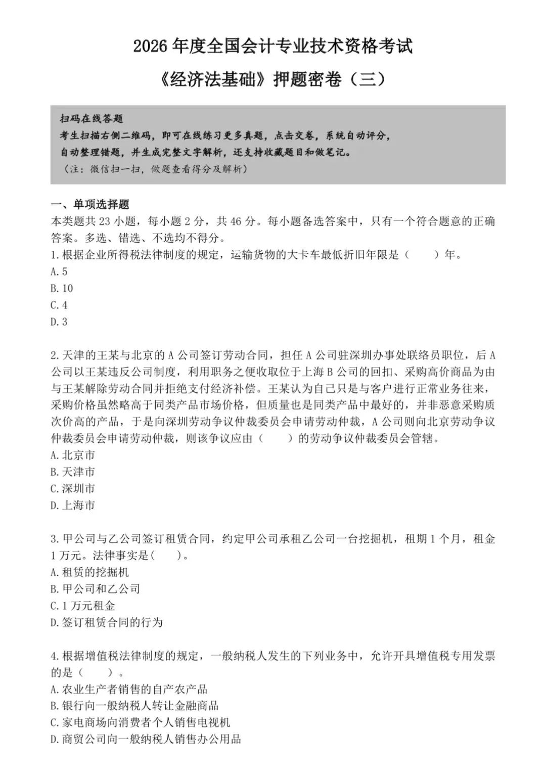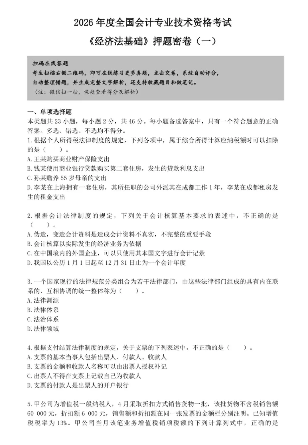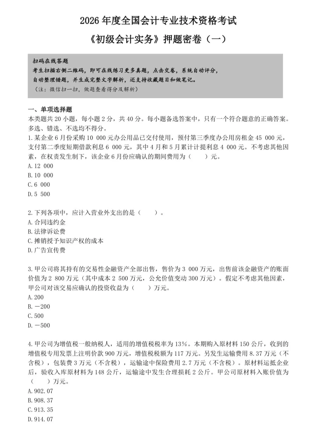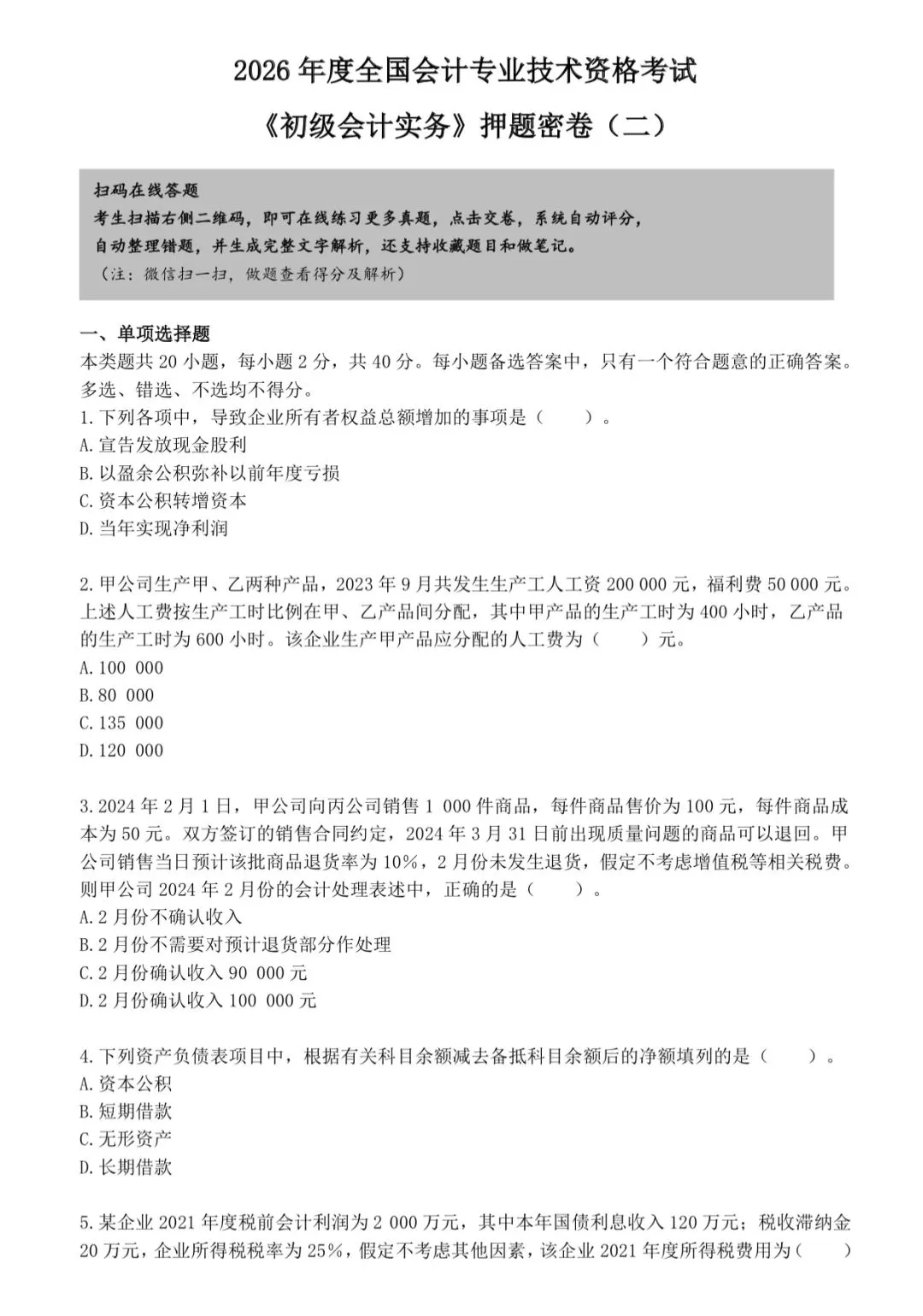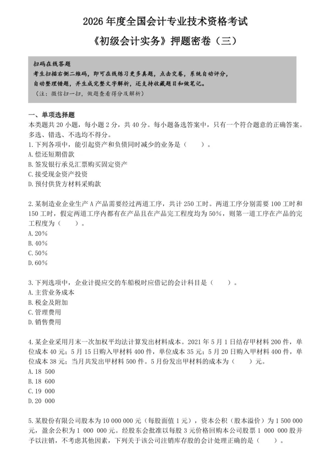 【初级会计】2026年初级会计押题密卷电子版PDF,考前必看!