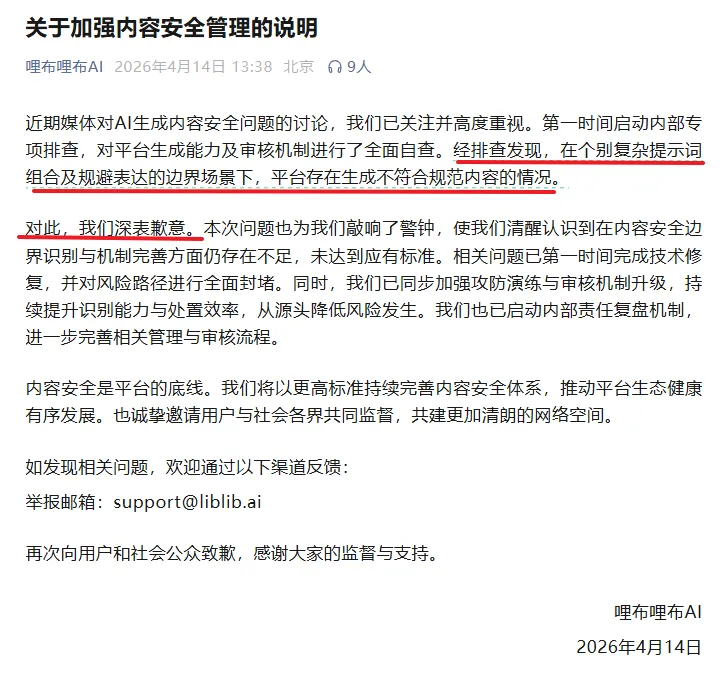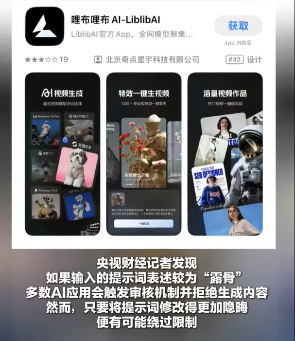 近日,央视曝光“AI涉黄”产业链,报道提到,在一款名为哩布哩布AI的AI应用里,记者输入在网上购买的提示词后,仅仅几分钟,这个AI平台就生成了一个半裸身体的女性跳舞视频。