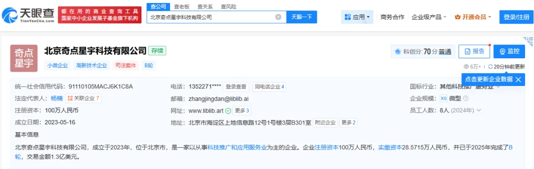 天眼查App显示,哩布哩布AI关联公司北京奇点星宇科技有限公司成立于2023年5月。公司融资历程显示,从2023年至2025年,已获得源码资本、高榕创投、金沙江创投、明势创投、巨人网络等多家基金的投资。