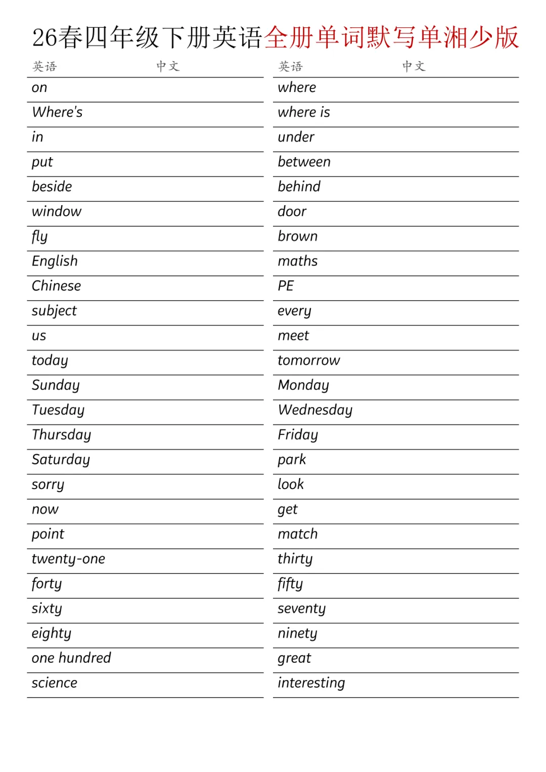 湘少版四年级下册英语26春全册单词默写单,电子版可打印 2026春教材已更新!课文跟读+单词听写 ↓↓↓点击图片,立即抢跑 ↓↓↓ 版面有限,不过多展示 需要直接点下方领取 完整电子打印版领取方式 ▲点击上方 儿童英语口语 在公众号消息框发送: 7735,即可领取