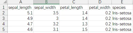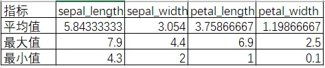 表格里面有四个五个字段,分别是sepal_length(萼片长度)、sepal_width(萼片宽度)、petal_length(花瓣长度)、petal_width(花瓣宽度)、species(品种分类标签)等,总150条没有异常值。