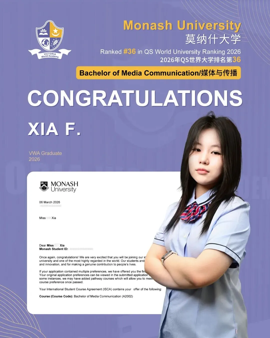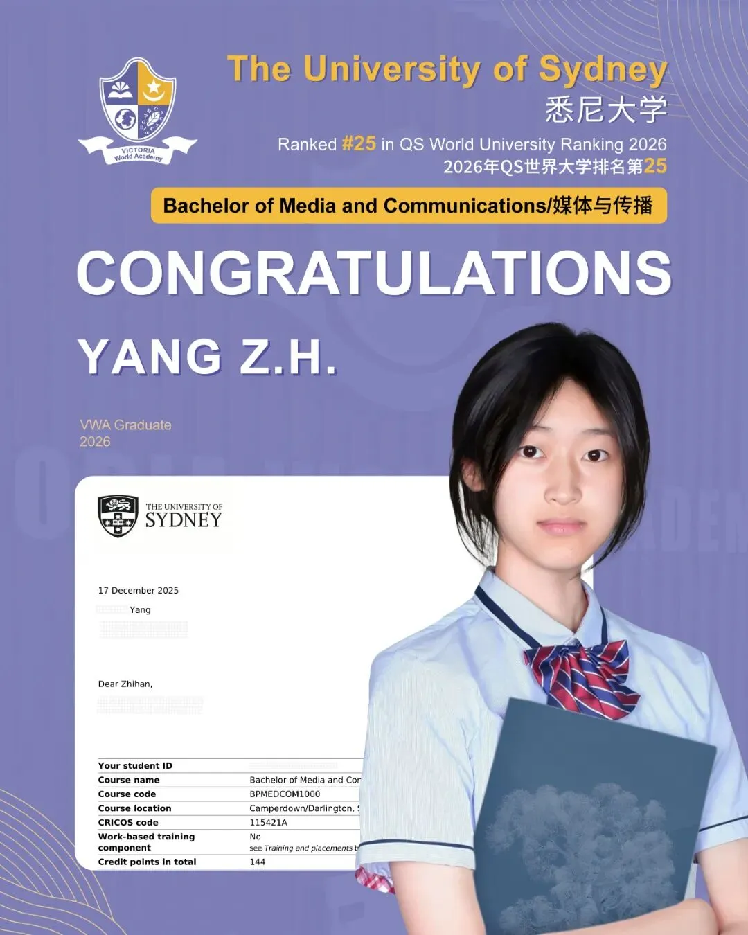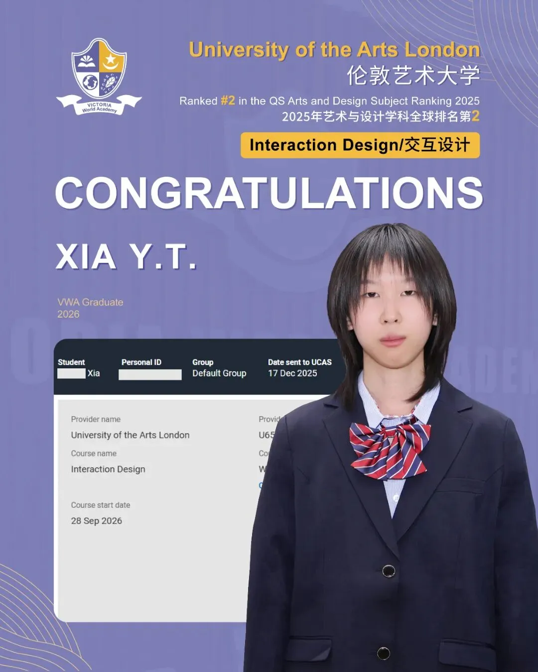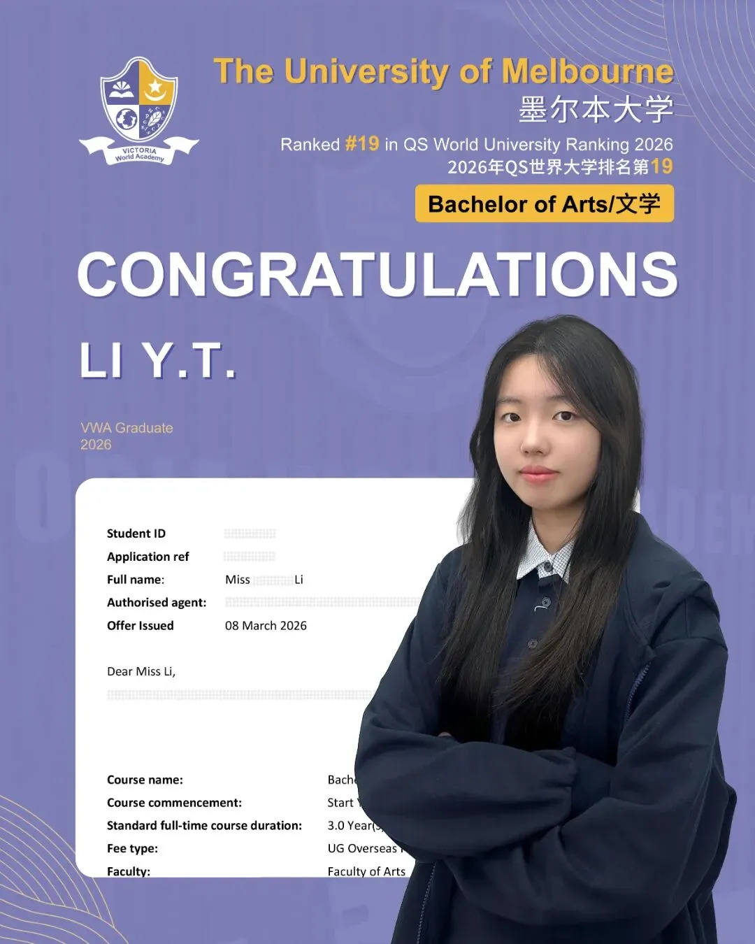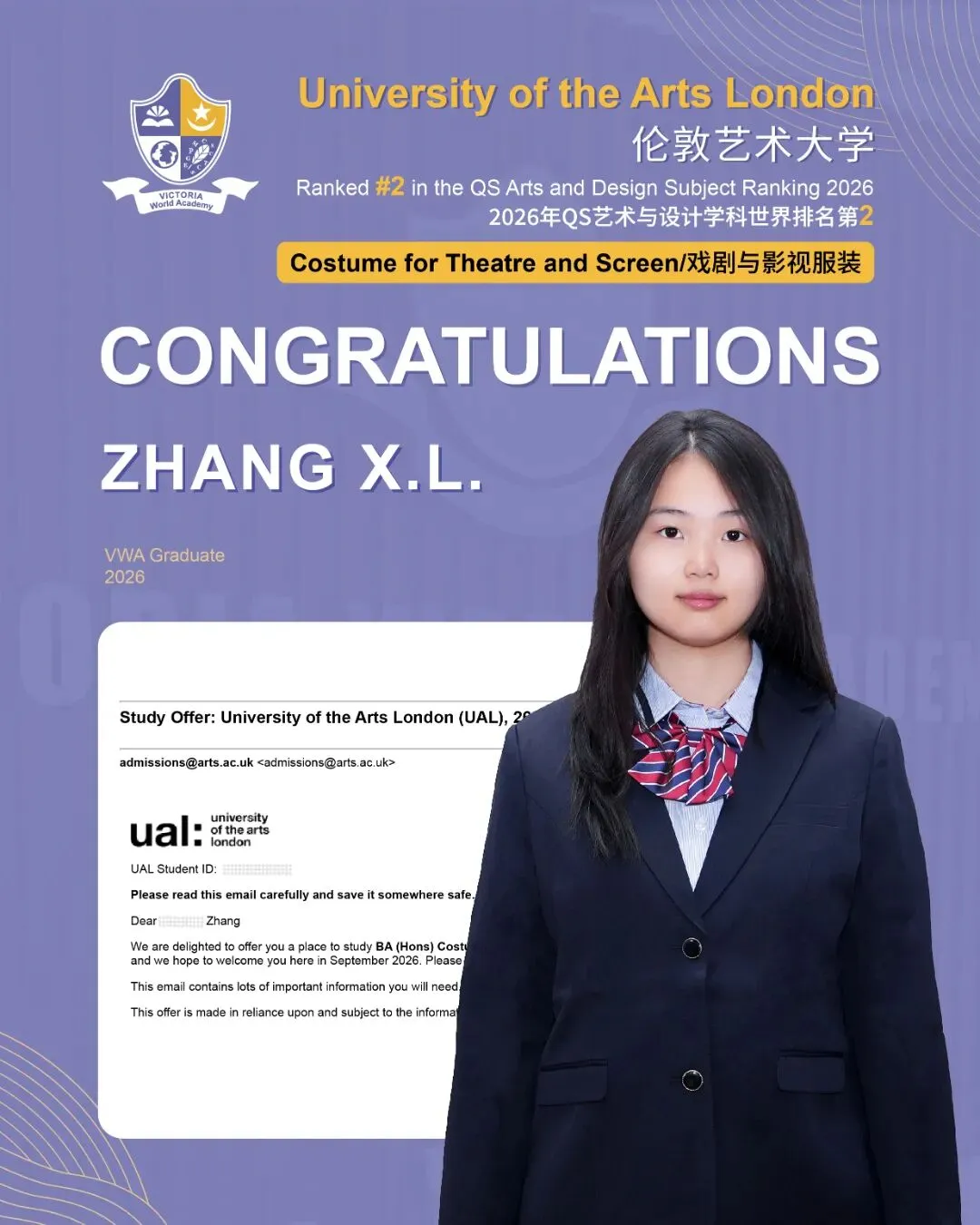 2026年申请季,维多利亚世界学院艺术班学子收获伦敦艺术大学、墨尔本大学、悉尼大学、金斯顿大学等世界名校offer,涵盖艺术专业与人文专业两大方向,院校类型兼顾艺术殿堂级院校与顶尖综合大学,充分展现艺术生的多元发展路径: