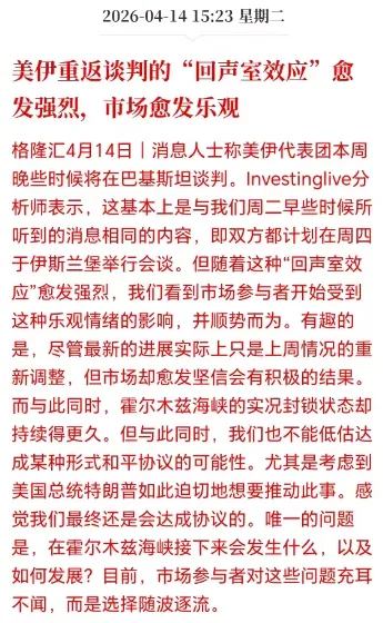 美伊重新谈判的消息在周末初次谈判破裂时就有预期,昨天也有继续跟进,但今天各种媒体都在反复报道这条消息,就是抓着一条利好消息反复念叨,这是非常乐观的情绪。但实际上也有些危险,就像抓住一根稻草不松手的模样。
