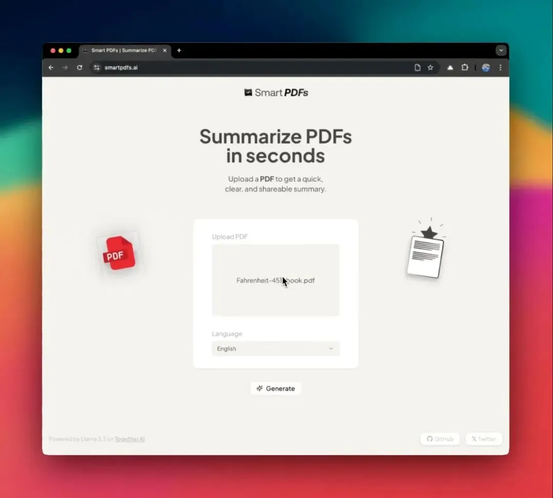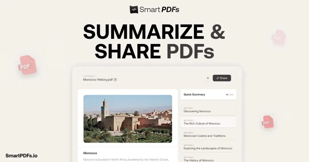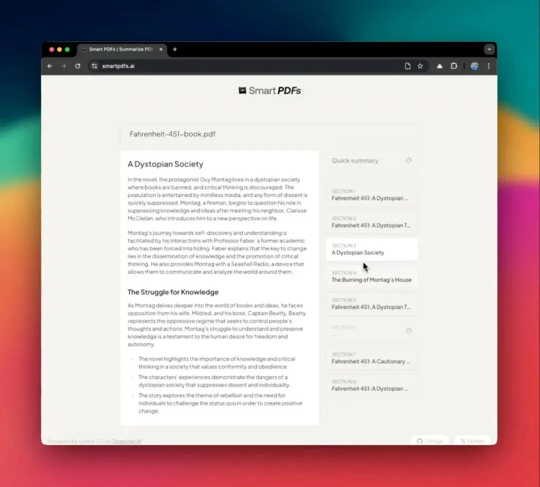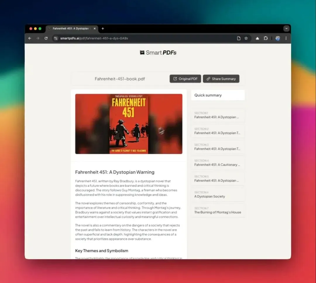 SmartPDFs到底是个啥?简单来说,SmartPDFs是一款基于AI的PDF摘要与分节工具。只要你上传PDF,它就能在几秒内,自动给你:
