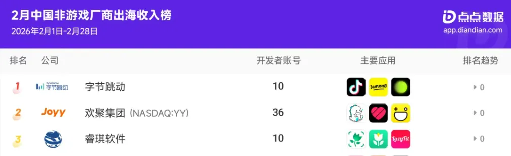 在点点数据公布的2026年1月及2月中国非游戏厂商出海收入榜中,一个并不算高调的名字,悄然出现在第三的位置——睿琪软件。