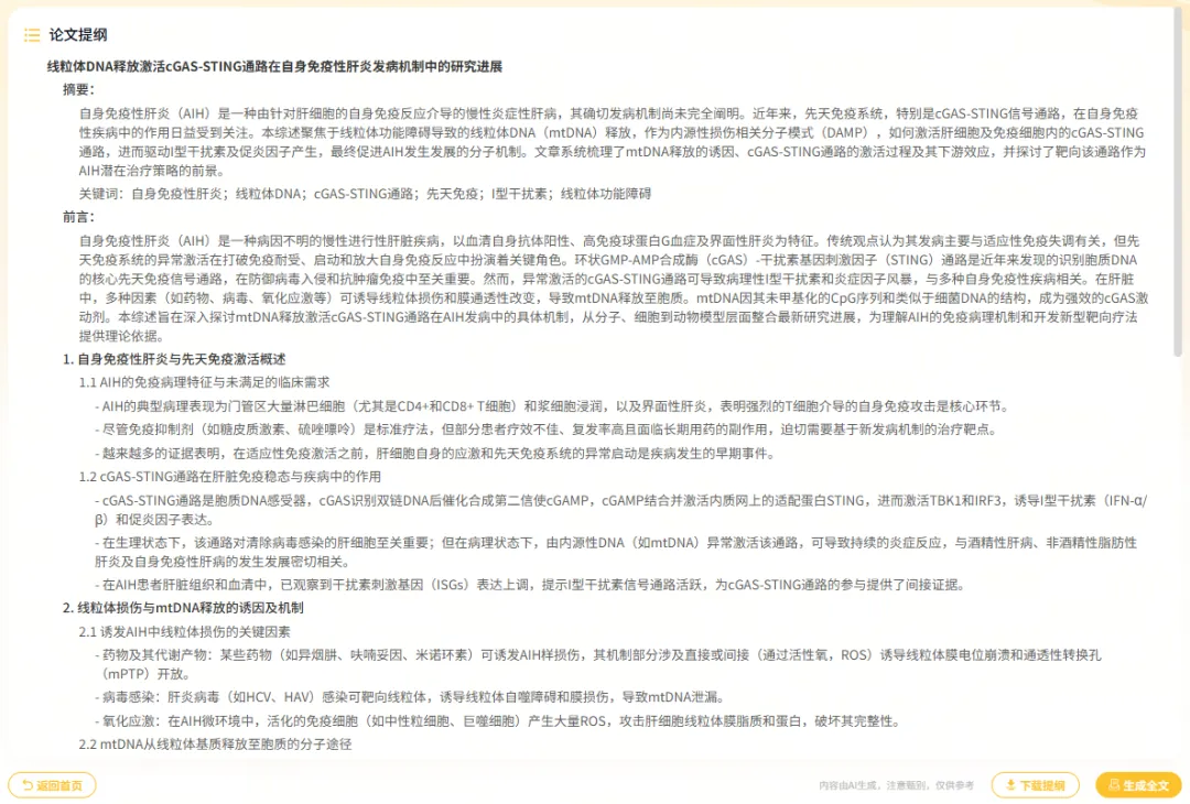 但解螺旋综述AI写作工作台不一样。你只需要把你的想法,或者几个关键词丢进去,它就能利用AI先帮你构建一个有内在逻辑的提纲——比如自动分类出”研究背景”、”分子机制”、”临床转化”、”未来展望”,而不是简单的罗列。
