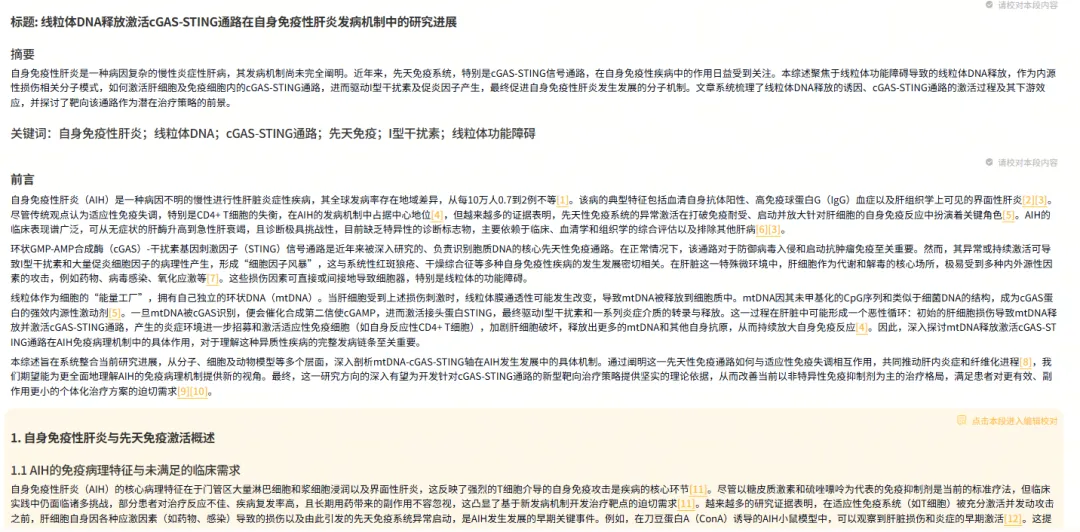 更关键的是它的文献综述撰写功能。生成提纲后,它能够基于PubMed的海量数据库,直接填充内容并自动生成参考文献。