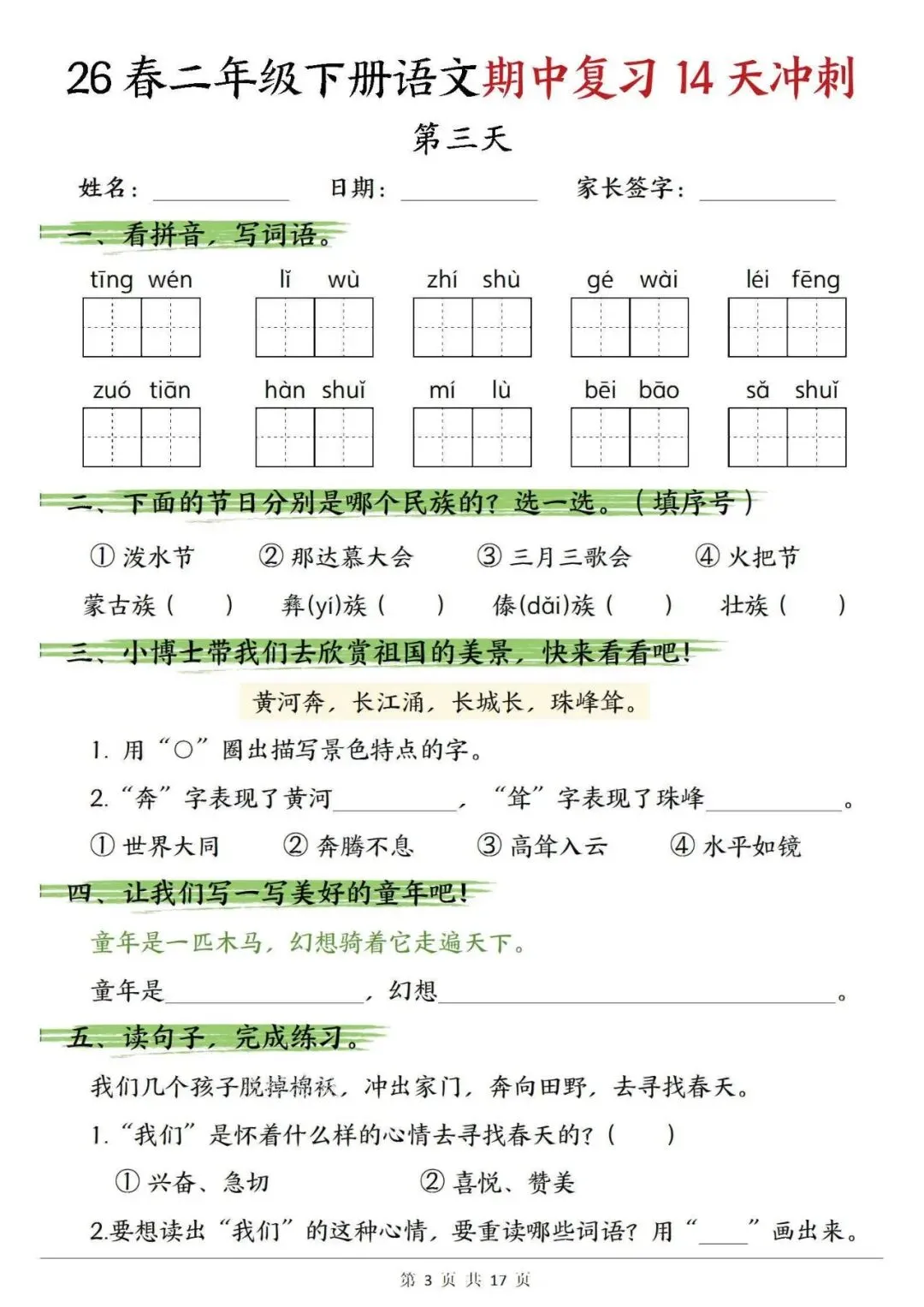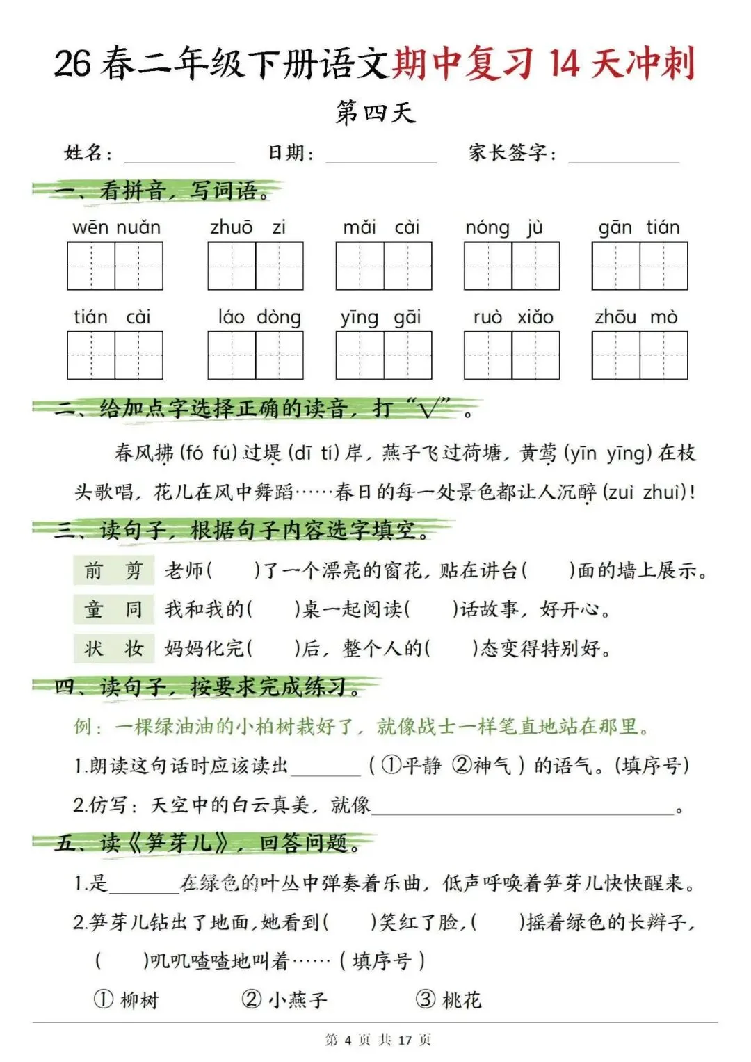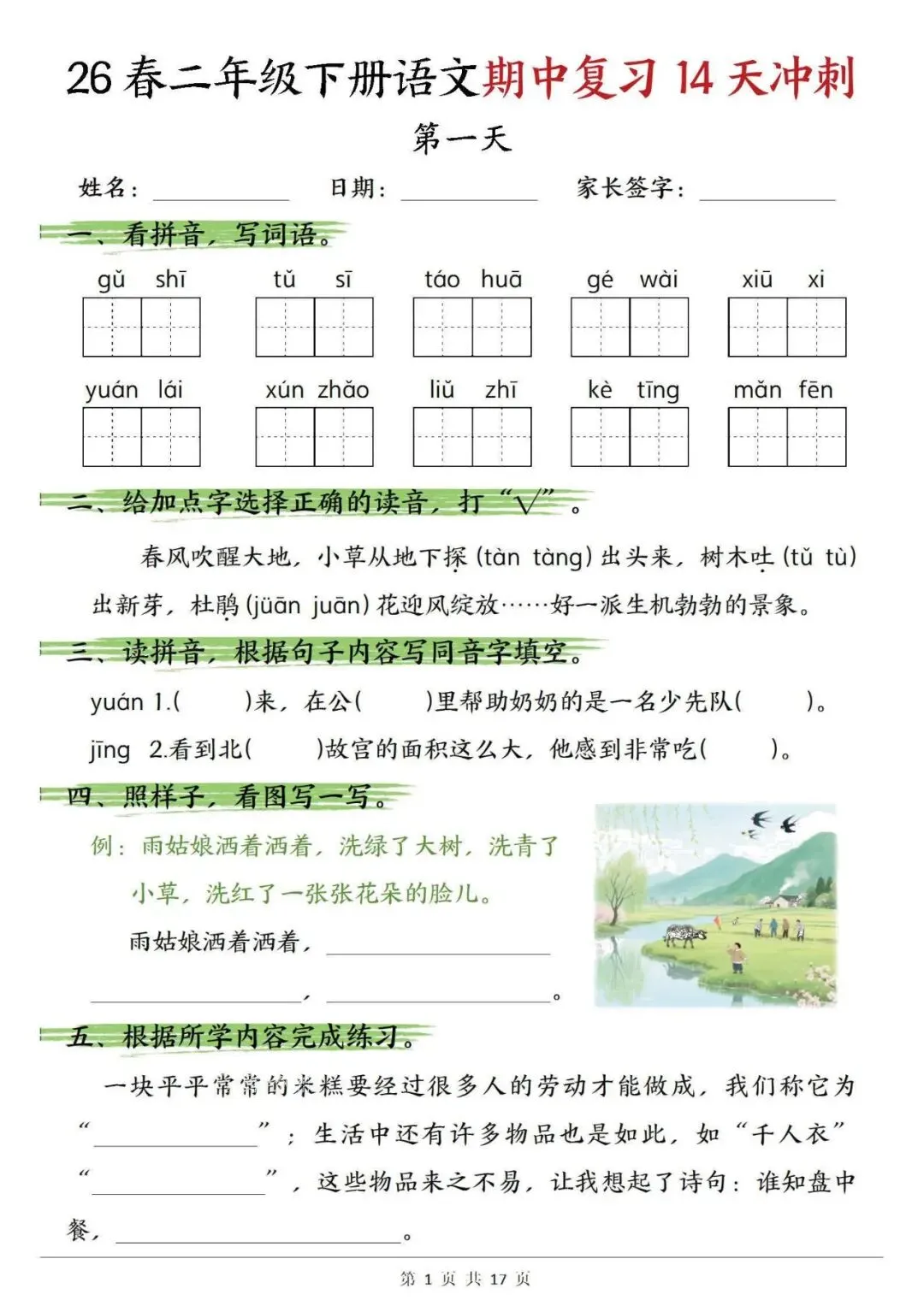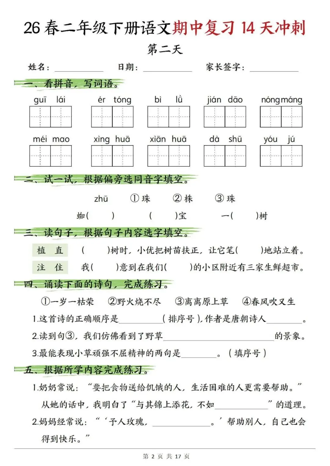 【免费下载打印】2026春二年级语文下册期中复习14天冲刺(含答案17页),PDF电子版,先保存后下载