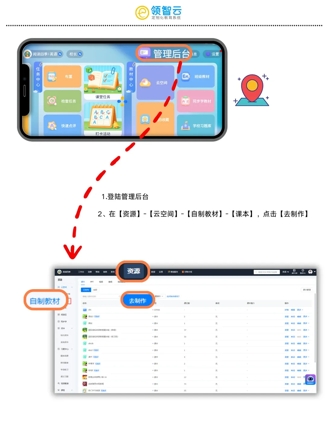 登录领智云 APP 管理后台,在【资源】-【云空间】-【自制教材】-【课本】,点击【去制作】,开启点读教材制作。
