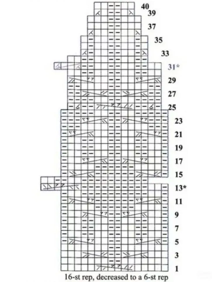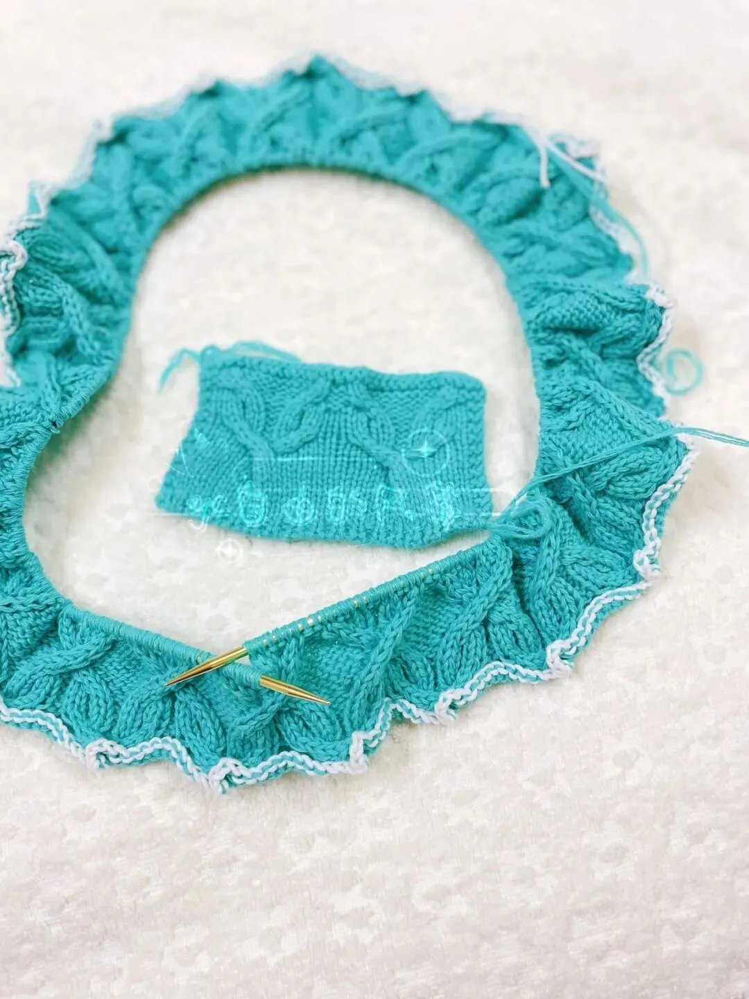 别线起368针,3.75mm圈织花样,16针一组花样,共23组,按图解织花型40行,织完剩138针,换3.25mm针均匀收10针至128针织10行双罗纹收针