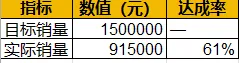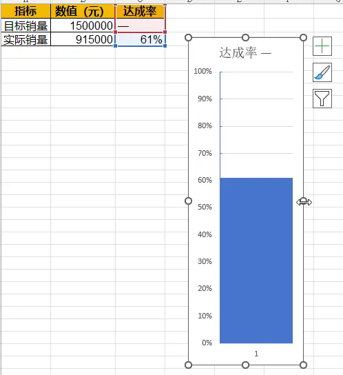 我们以「Q3 季度销售目标达成率」为例,目标销量 150 万,实际销量 91.5 万,达成率 61%,用温度计图表清晰展示进度。